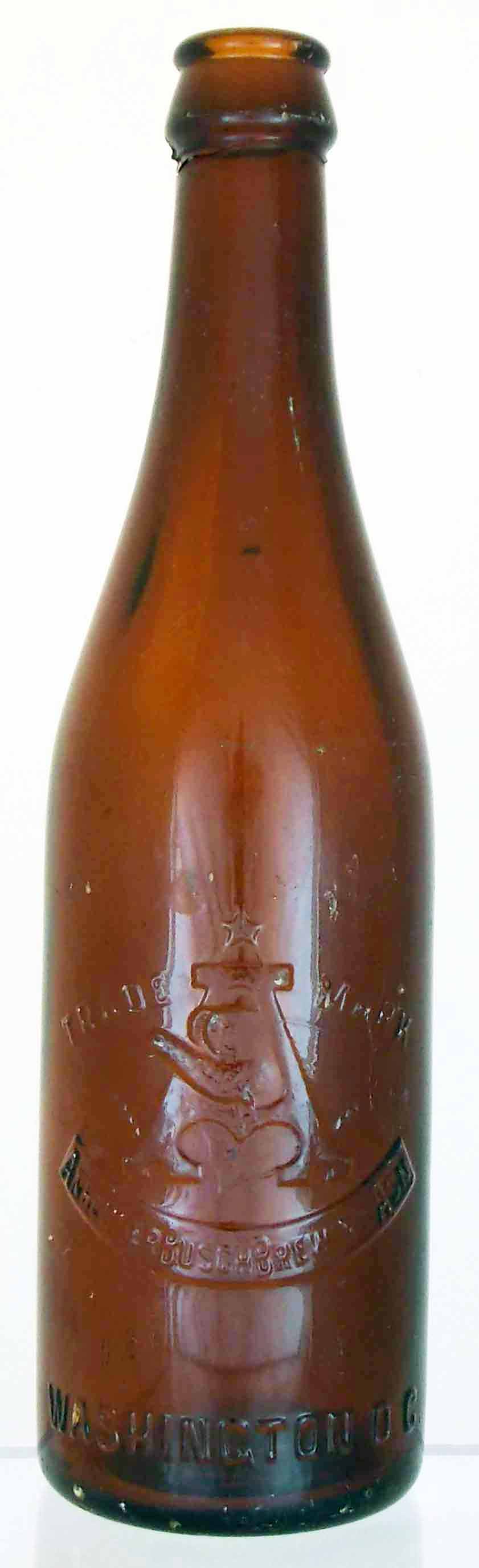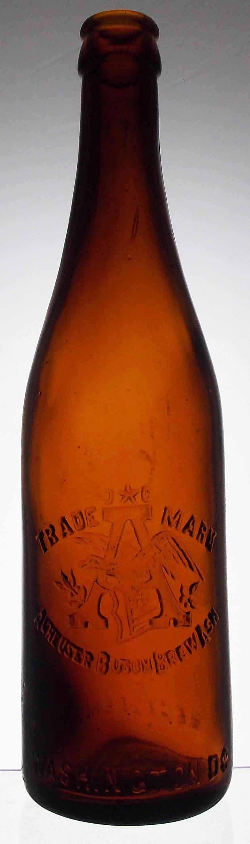 book # 25 The only difference between this bottle and #23 a few rows above, is that this one is machine-made. It's a 9.5" tall, machine-made crown top bottle embossed: front: TRADE MARK / (eagle inside letter 'A') / ANHEUSER BUSCH BREWING ASN front heel: WASHINGTON, D.C. back heel: REGISTERED |
