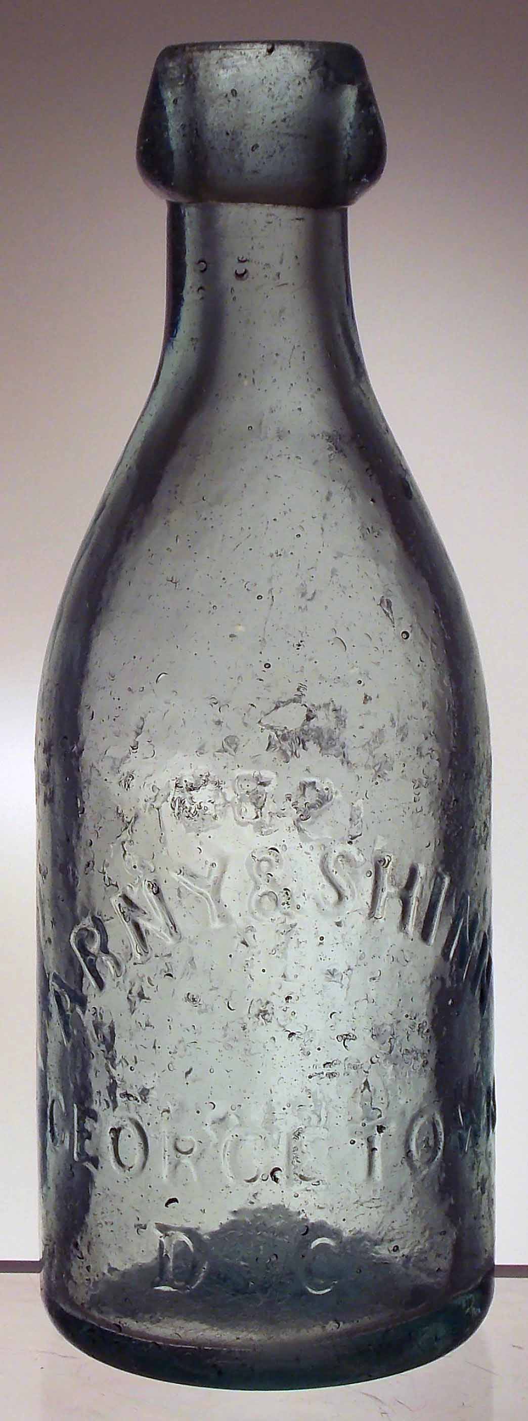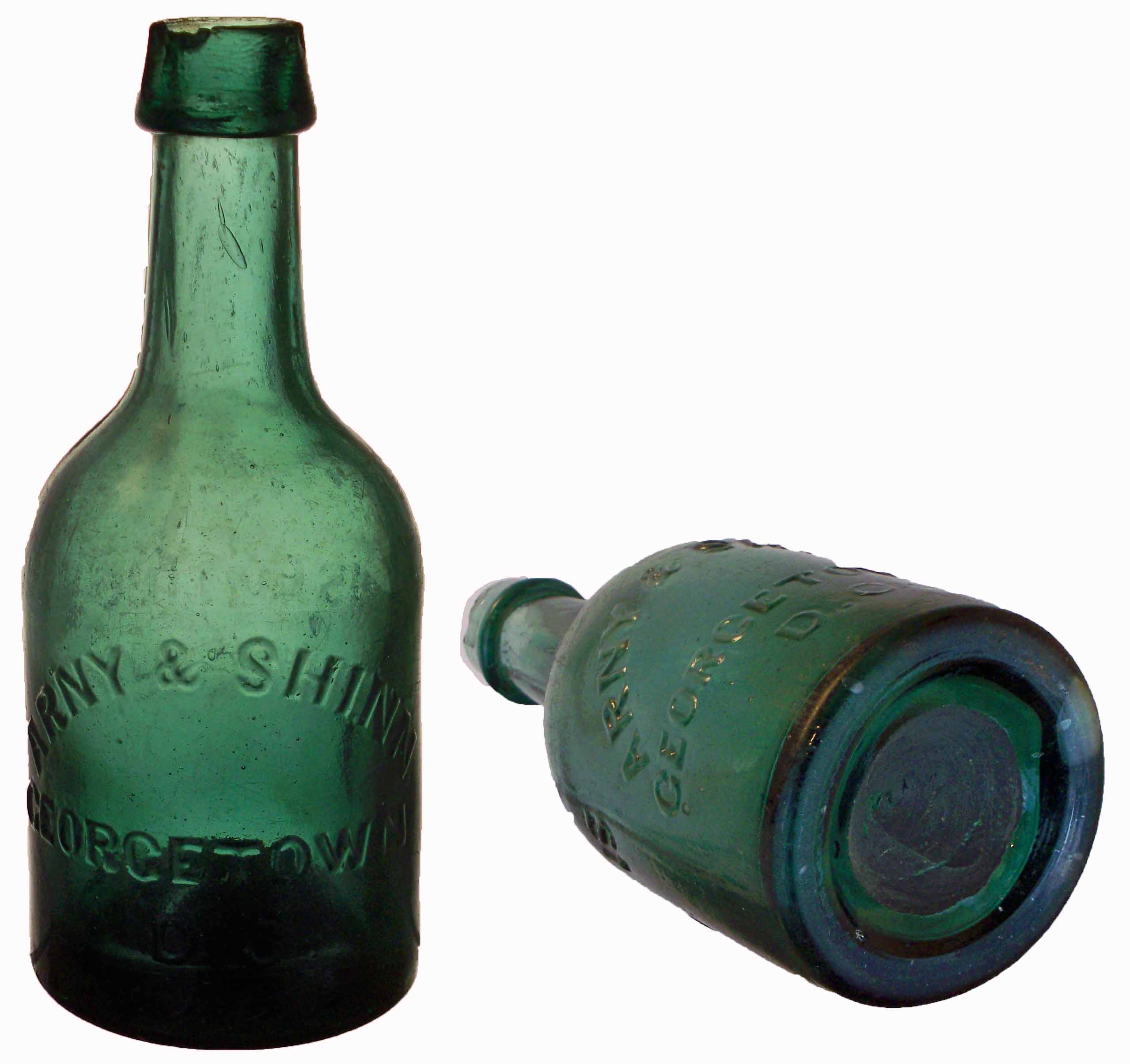 book # 57 This is an aqua, 7.25" squat blob-top bottle (with the top broken off). It is embossed: front: ARNY & SHINN / GEORGETOWN, / D.C. back: THIS BOTTLE IS / NEVER SOLD base: (iron pontil scar) |