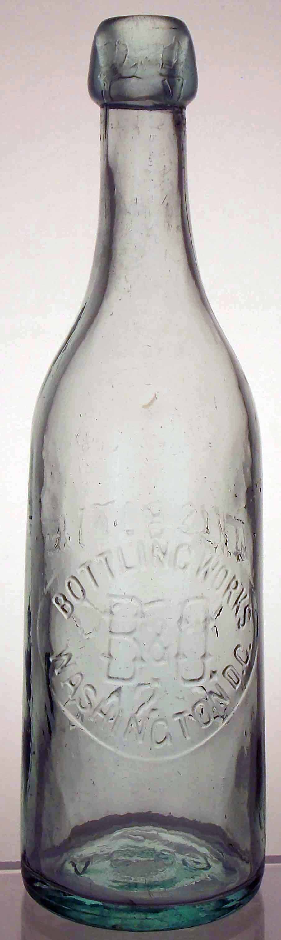 book # 90 This is a 9.5" aqua blob-top bottle, embossed: round slug plate: B&O / BOTTLING / WORKS / WASHINGTON, D.C. base: M C |