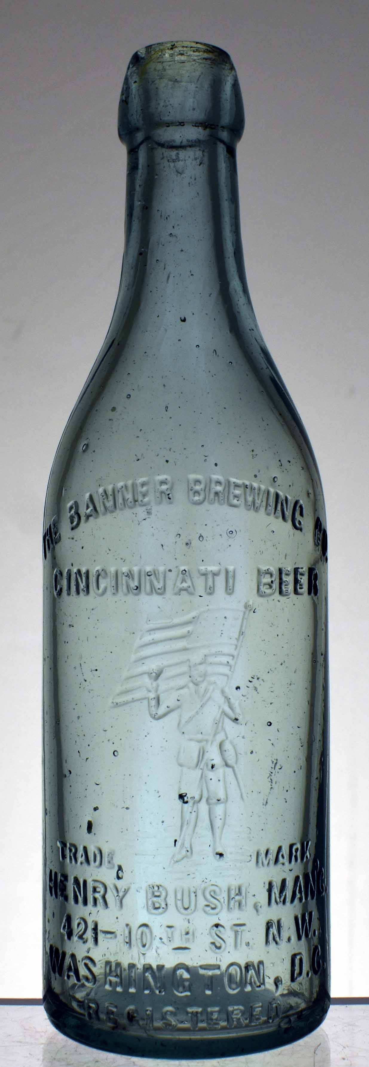 book # (unlisted) This is a 9" aqua blob top bottle embossed: front: THE BANNER BREWING CO. / CINCINNATI BEER / (picture of soldier holding an American flag) / HENRY BUSH, MAN'G. / 421-10TH ST. N.W. / WASHINGTON, D.C. / REGISTERED |