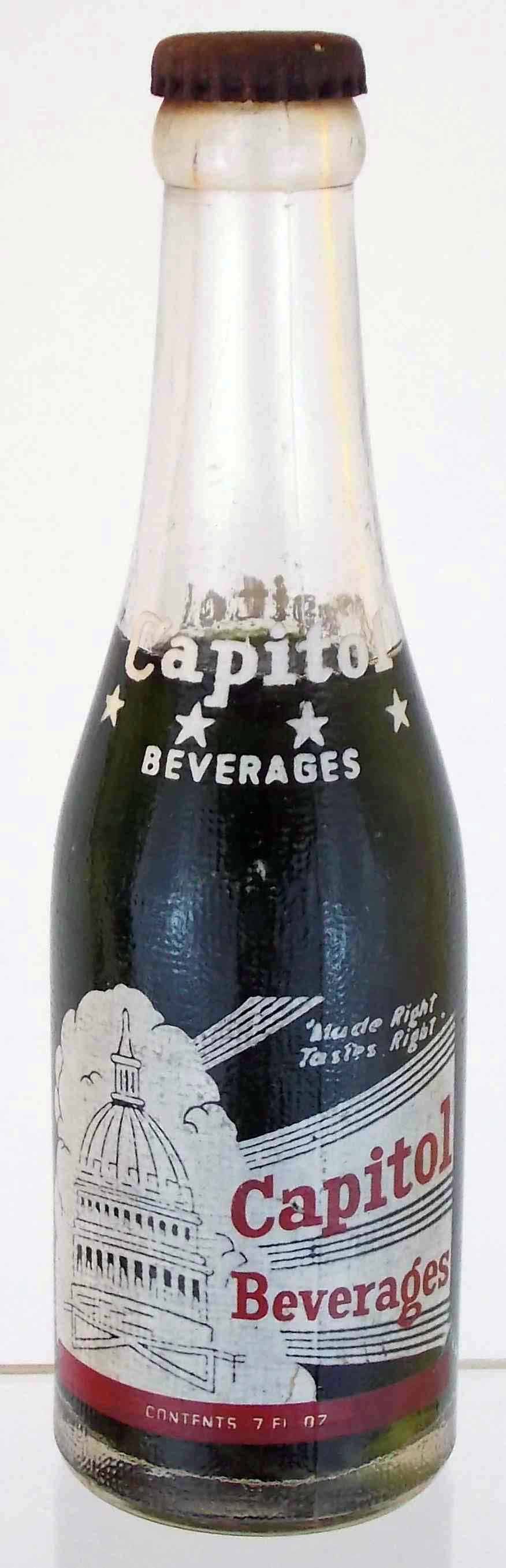 book # 128 This is almost identical to the bottle above, but it doesn't have the word "club" on it (i.e. it says "Capitol Beverages" instead of "Capitol Club Beverages". It's an 8" tall machine-made, stipled crown-top with red on white ACL: neck-front/back: Capitol / * * * * / BEVERAGES front: "Made Right / Tastes Right" / Capitol / Beverages / Contents 7 FL OZ back: EVERY BOTTLE STERILIZED / A WHOLESOME BEVERAGE / MADE OF FINE FLAVORS CANE SUGAR / FILTERED CARBONATED WATER / AND CERTIFIED COLOR. / SEE CROWN FOR OTHER INGREDIENTS / CONTENTS 7 FL. OZ. / CAPITOL BEVERAGE CO. / WASHINGTON, D.C. base: 6 / 182 S / [] |