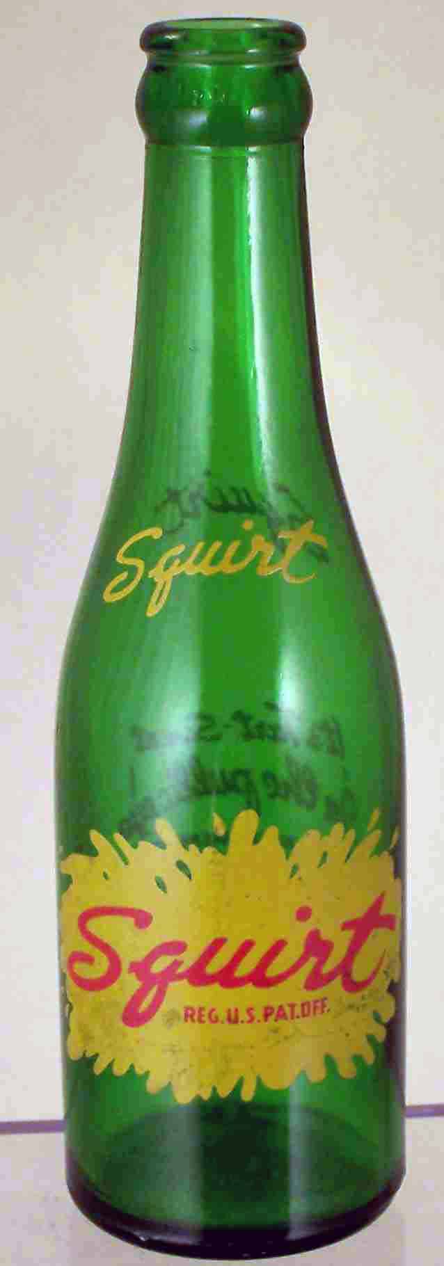 book # 655 This is an 8" green machine-made crown top bottle with yellow & red markings: front & back shoulders: Squirt front: Squirt / REG. U.S. PAT. OFF. back: Squirt / It's Tart-Sweet / In the public eye / DRINK BEFORE BREAKFAST / WITH MEALS - FOR / REFRESHMENT ANY TIME / CONTAINS CARBONATED / WATER, SUGAR, GRAPEFRUIT / JUICE, CITRIC ACID / AND GRAPEFRUIT OIL / CONTENTS 7 FL. OZ. / PROPERTY OF / SQUIRT BEVERAGE CO / WASHINGTON, D.C. base: 700 G 29 |