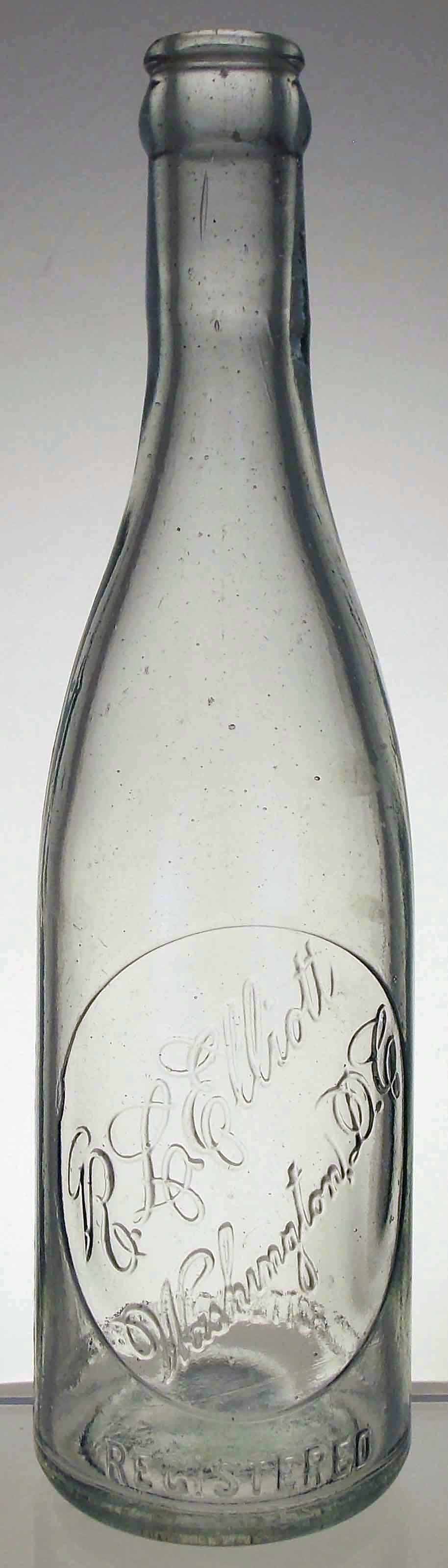 book # 228 This is a clear, 9.7" crown top bottle embossed: oval slugplate (in script): R.L. Elliott / Washington, D.C. front heel: REGISTERED rear heel: THIS BOTTLE NOT TO BE SOLD |