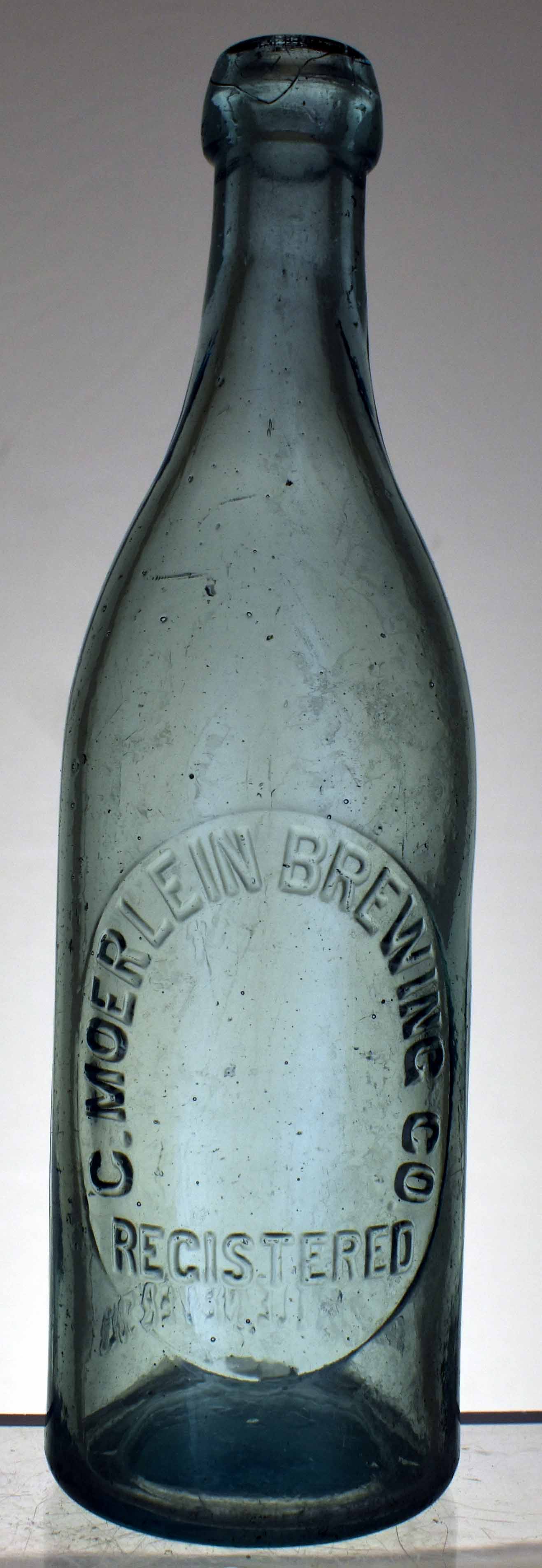 This is a 9" aqua baltimore-loop blob top bottle embossed: oval slug plate: C. MOERLEIN BREWING CO / REGISTERED