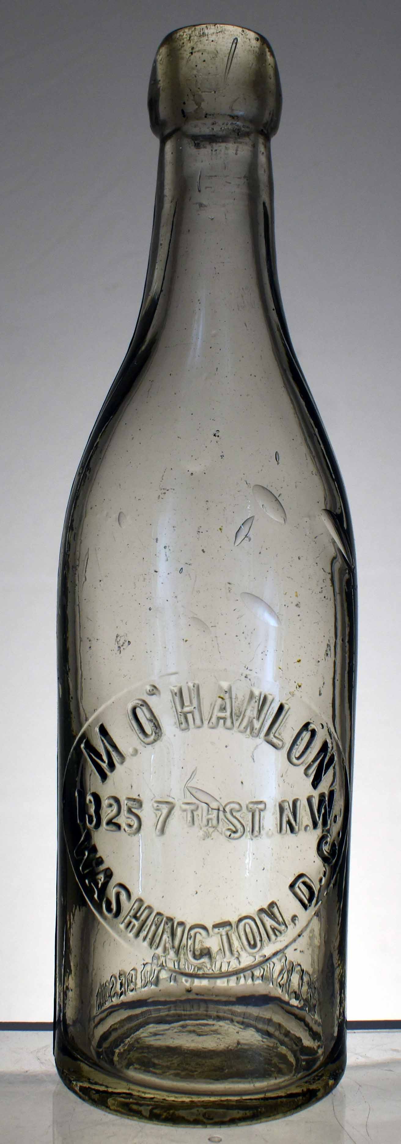 book # 454 This is a 9.2" clear blob top bottle embossed: round slug plate: M. O'HANLON / 1325-7TH ST. N.W. / WASHINGTON, D.C. rear: REGISTERED NOT TO BE SOLD This one says "7TH", but the "TH" has a dot under it, when it was probably supposed to be underlined. |