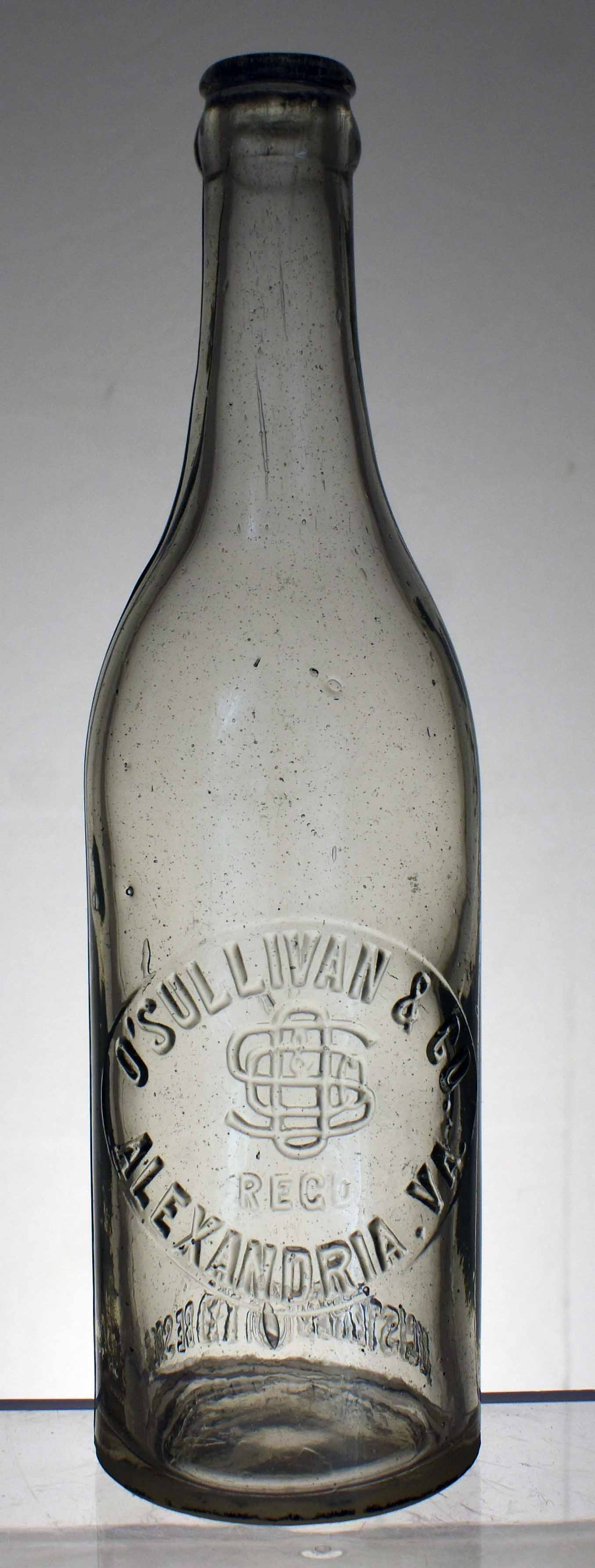 book # 467 This is a 9.25" clear crown-top bottle embossed: round slugplate: O'SULLIVAN & CO. / ('OS&Co' logo) / REGD / ALEXANDRIA, VA. rear heel: THIS BOTTLE NOT TO BE SOLD Unlike the bottle above, this one looks like it had a new slugplate that doesn't have "GREENE" peened out. |
