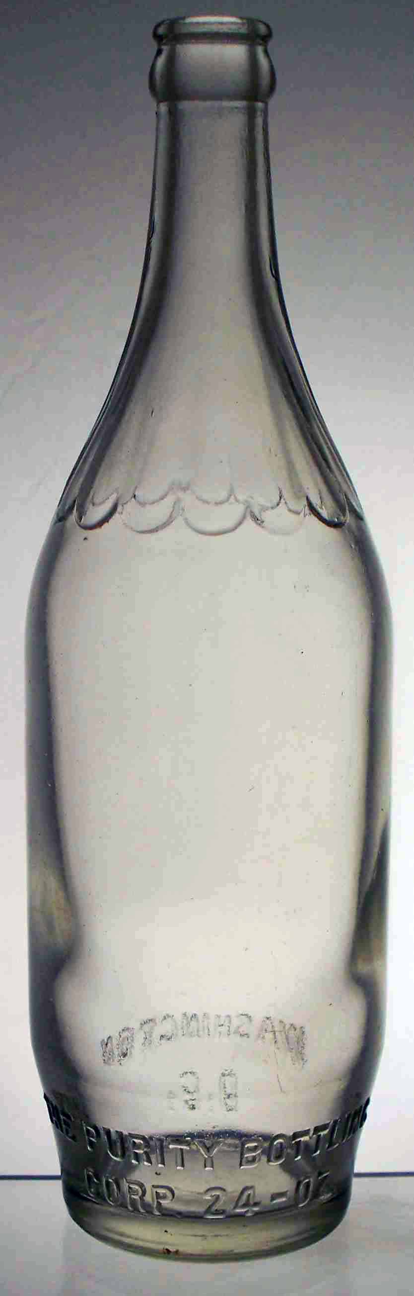 book # 570 This is an 11" clear machine-made crown top bottle embossed: shoulder: (wavy pattern) front heel: THE PURITY BOTTLING / CORP. 24 - OZ. back heel: WASHINGTON / D.C. |