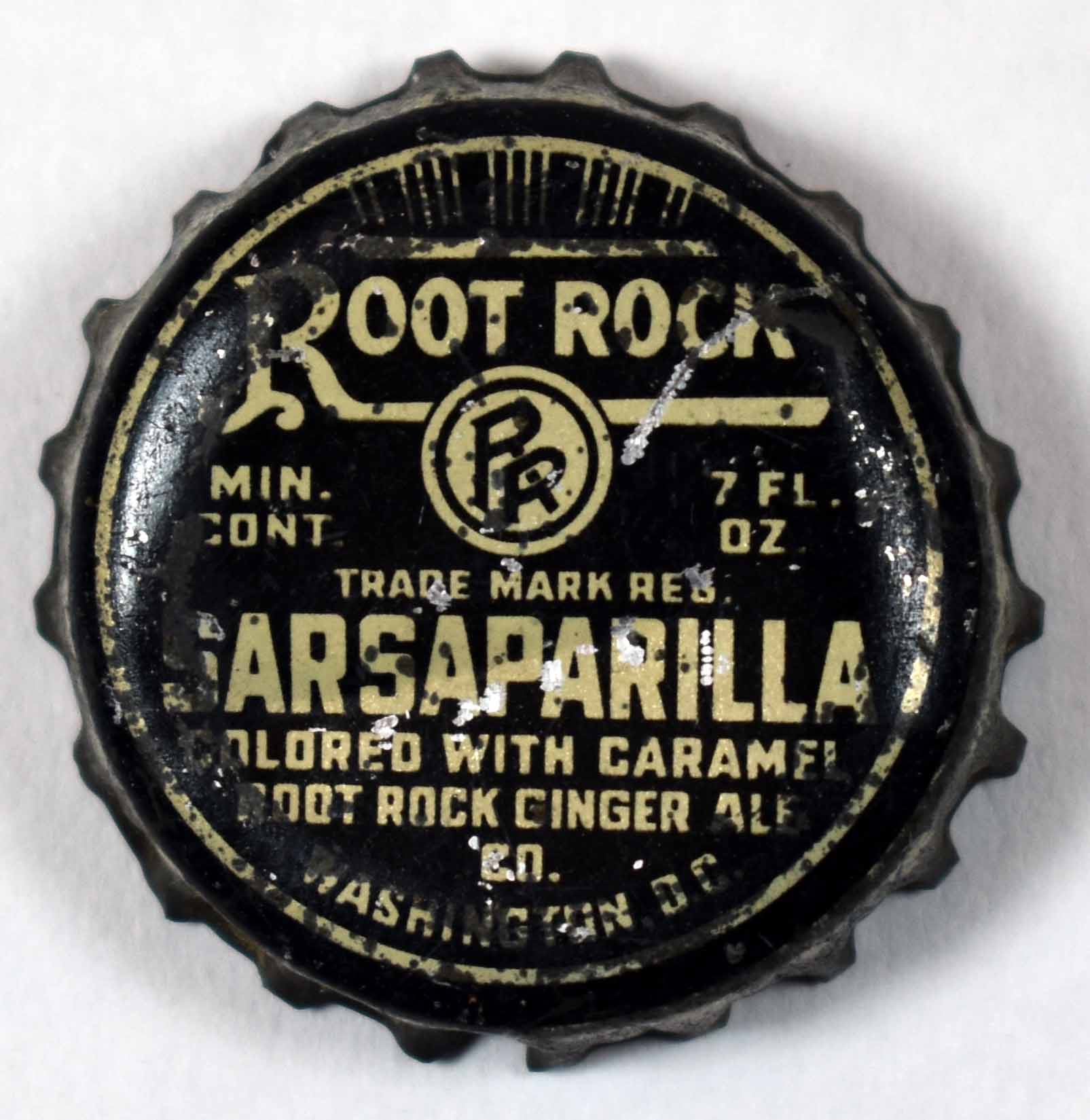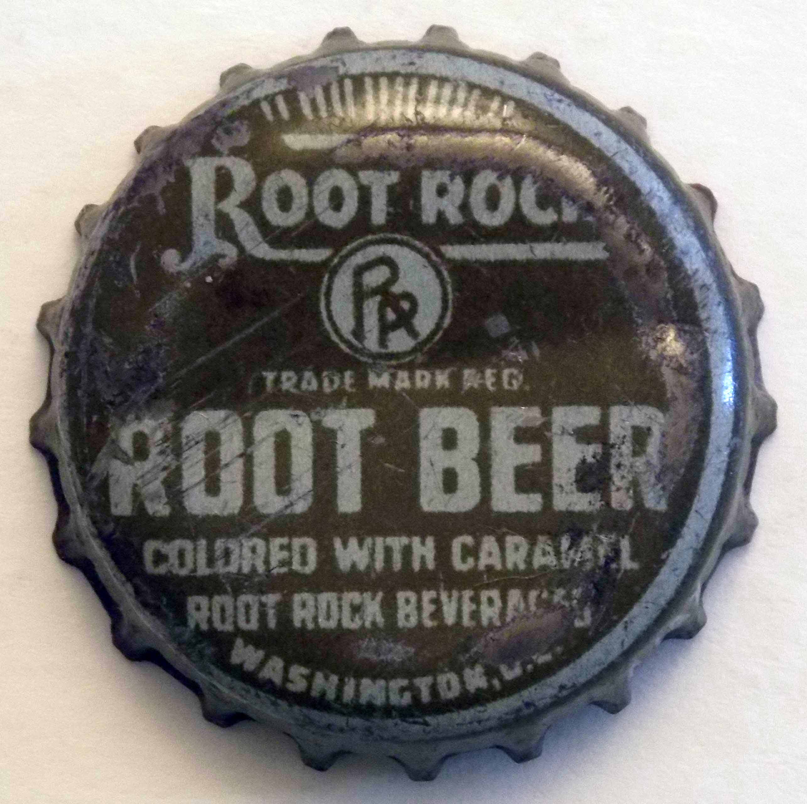 book # 603 This is similar to the above bottle, except that it is not stipled, and the markings are all white with no red. It is a 10" aqua crown top bottle with a white ACL: front: REFRESHING-HEALTHFUL / ROOT ROCK / FAMOUS FOR IT'S TASTE / Sparkling / Bracing / Beverage / ROOT ROCK / BEVERAGES back: Contains / FILTERED / CARBONATED WATER / CANE SUGAR / FLAVOR, CITRIC ACID / CERTIFIED COLOR / SEE CROWN / FOR OTHER INGREDIENTS. / CONTENTS ONE PINT / BOTTLED BY / ROOT ROCK BEVERAGES / WASHINGTON, D.C. |