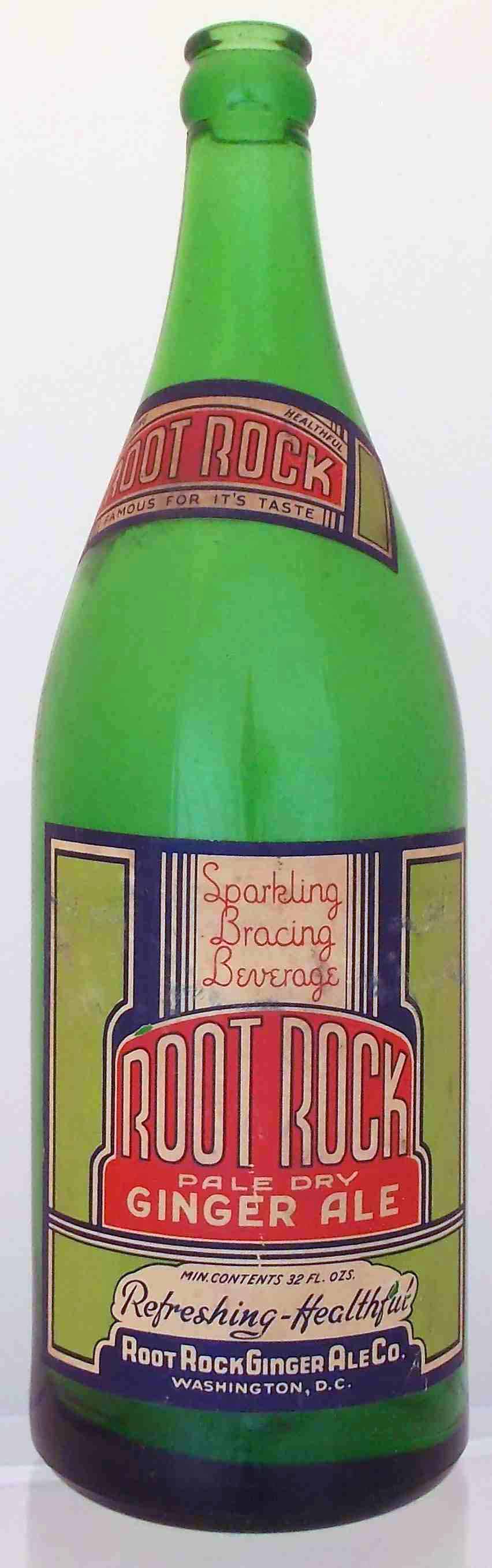 book # (unlisted) This is an 11.75" tall bottle with 2 labels that say: neck label: REFRESHING HEALTHFUL / ROOT ROCK / FAMOUS FOR IT'S TASTE large label: Sparkling / Bracing / Beverage / ROOT ROCK / PALE DRY / GINGER ALE / MIN. CONTENTS 32 FL. OZS. / Refreshing-Healtful / ROOT ROCK GINGER ALE CO. / WASHINGTON, D.C. Embossed on base : CONTENTS / 1 FULL QUART |