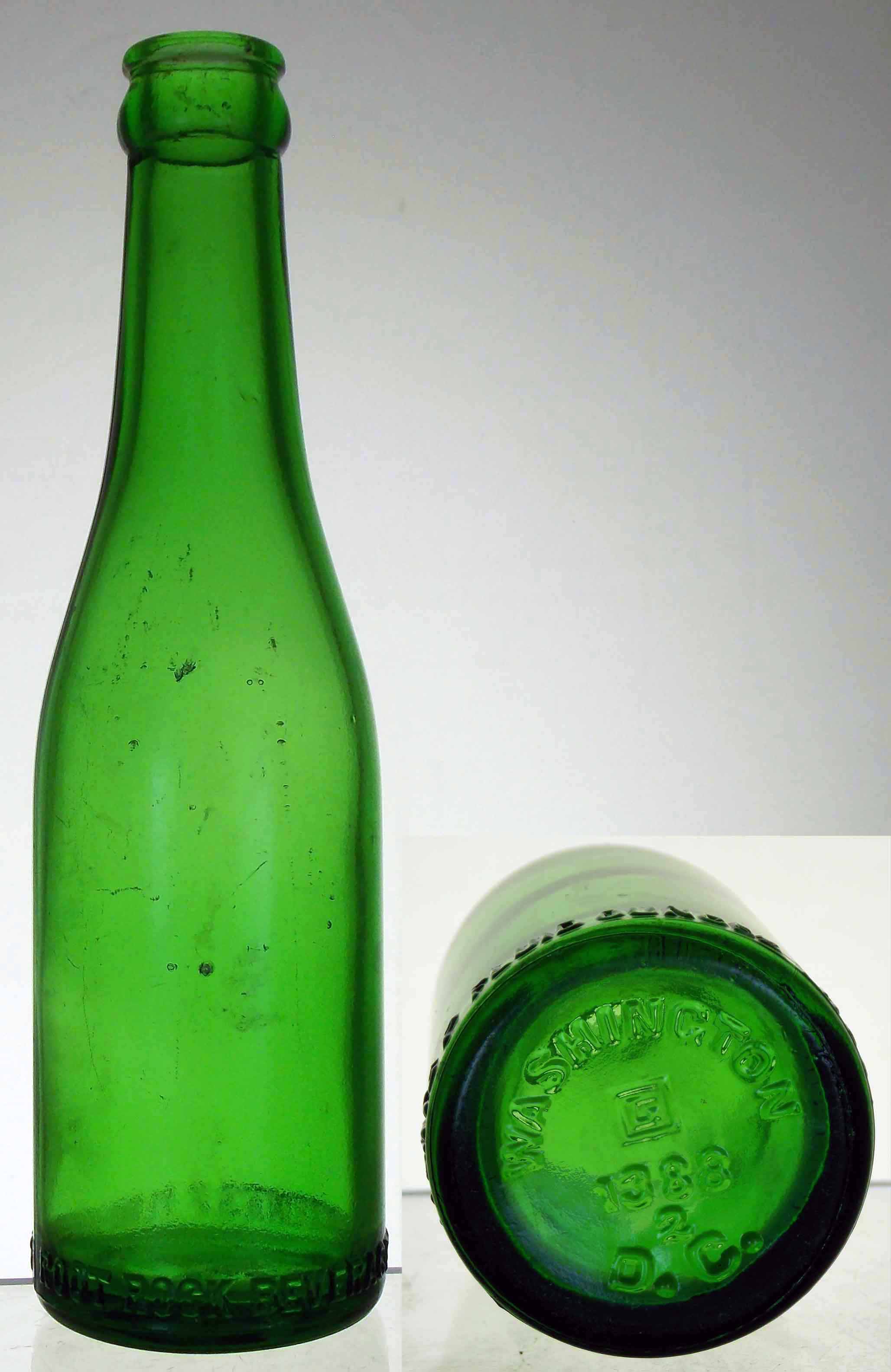 book # (unlisted) This is an 8.0" tall marchine-made green bottle embossed: front heel: ROOT ROCK BEVERAGES rear heel: CONTENTS 7 FLUID OUNCES base: WASHINGTON / [G] / 1388 / 2 / D.C. The 'G' in a square embossed on the base means it was made by the Glenshaw Glass company. |