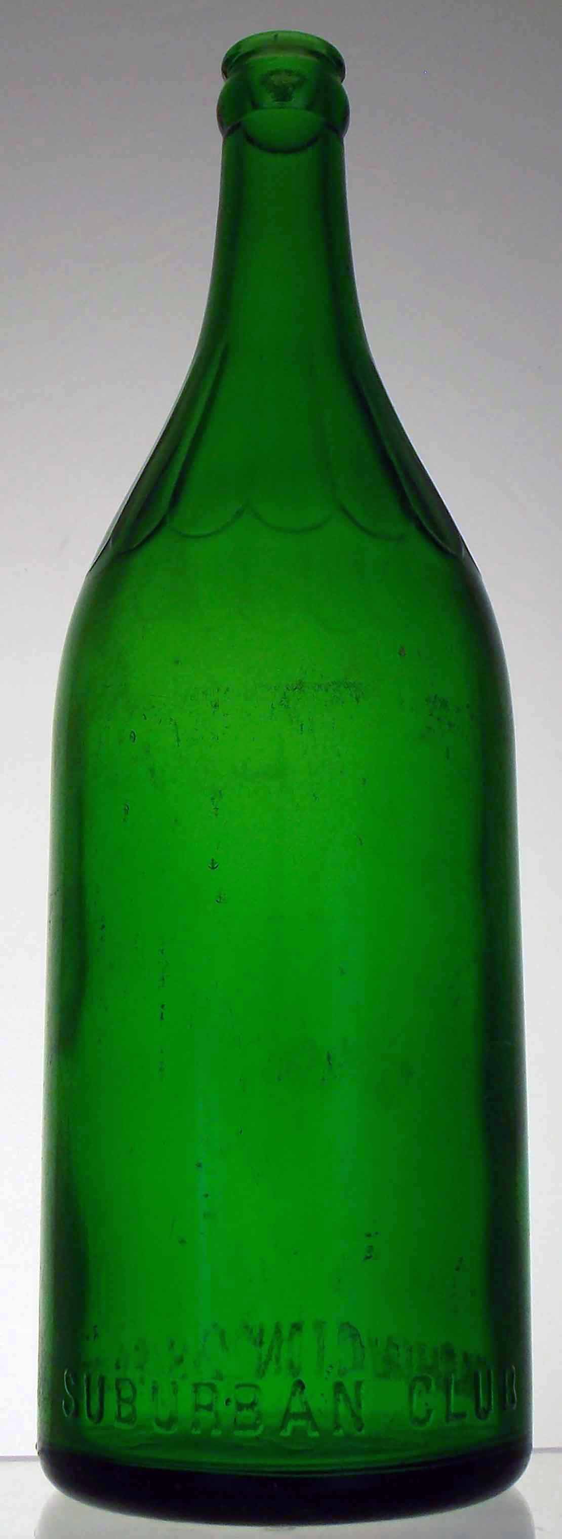 book # (unlisted) This is a green 11.25" green machine-made crown top bottle embossed: around heel: SUBURBAN CLUB WASHINGTON 28 FL. OZ. base: ('R' in a triangle) / S C / Z34 7 Note that this bottle says "WASHINGTON" but not "D.C.". Suburban Club was local to Washington DC and Maryland, so it's unlikely this bottle was from any city named "Washington" other than D.C. |