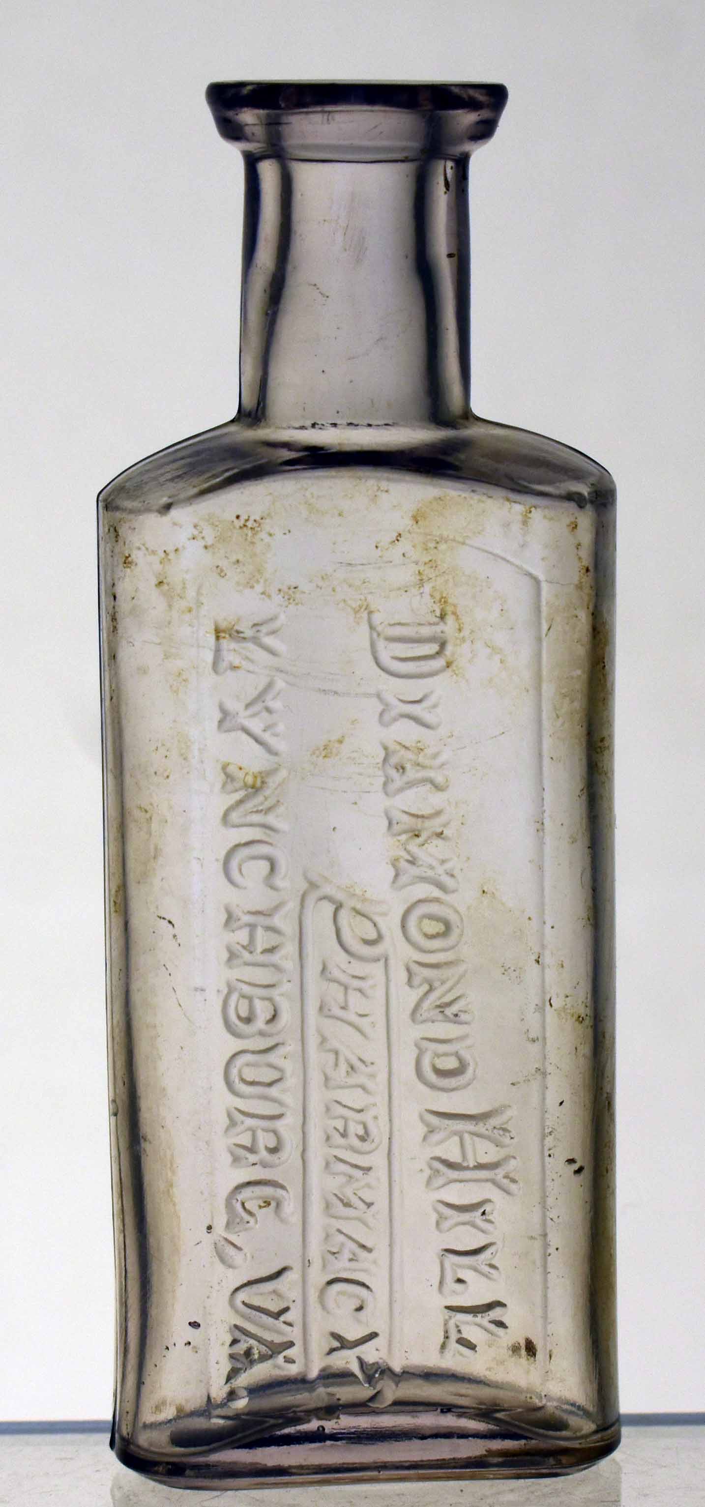 This is a clear 3.7" bottle embossed: vertical slug plate: DIAMOND HILL / PHARMACY / LYNCHBURG, VA. base: (too feint to read) |