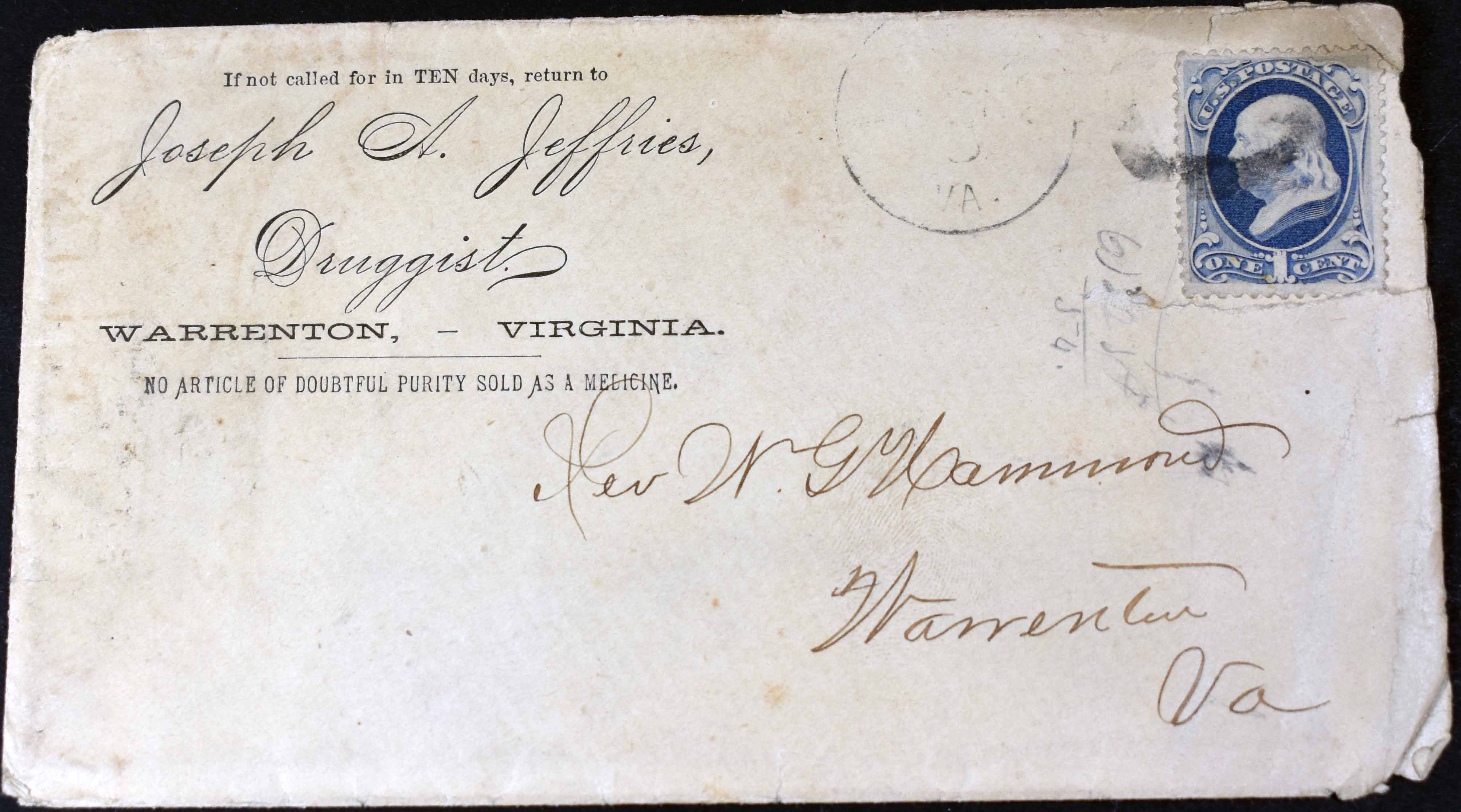 1 Alexandria Gazette, 13-Oct-1846, p.4 (earliest newspaper mention I could find for J H Stephens drugstore in Warrenton)