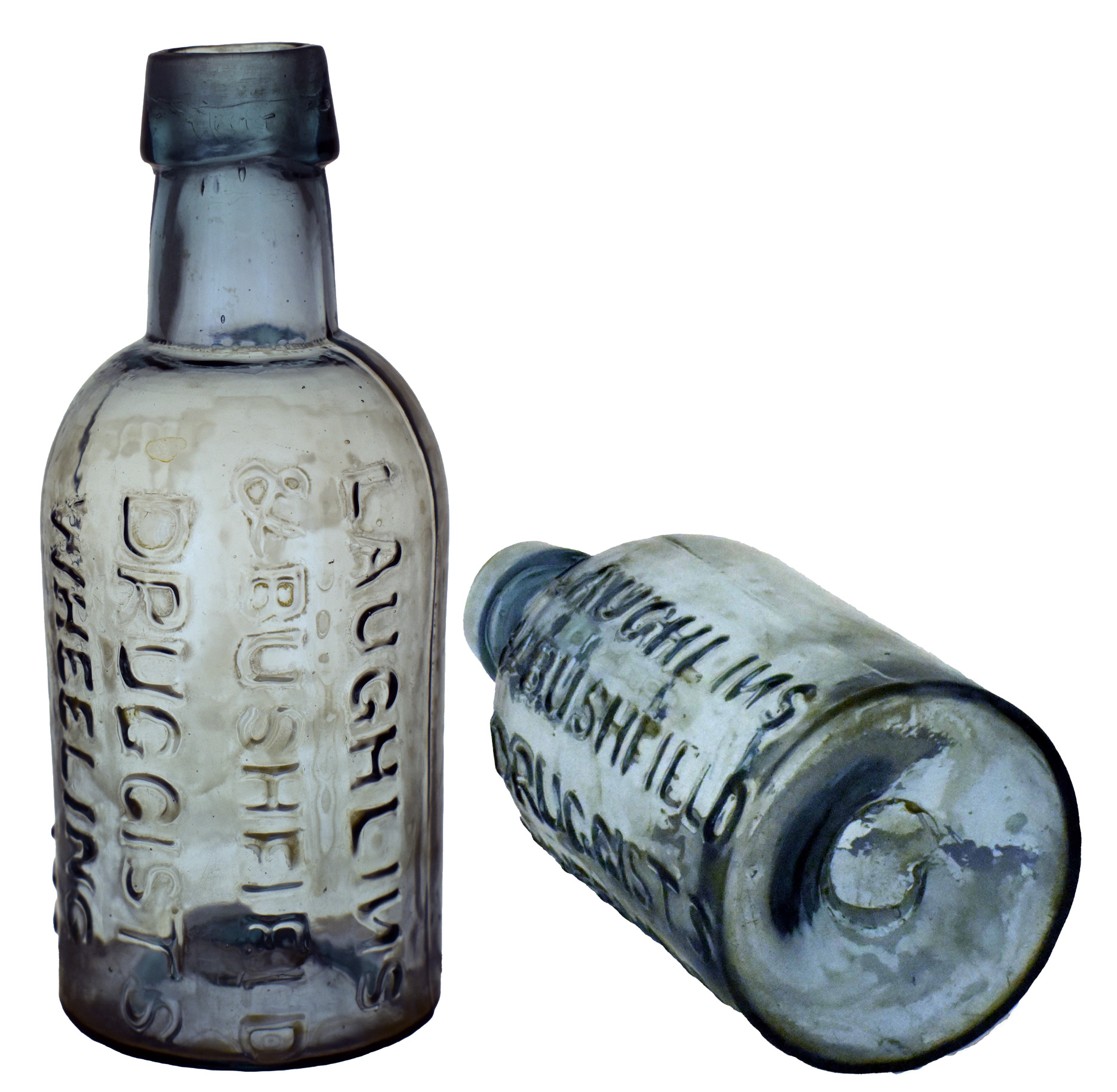 vertical: LAUGHLINS / & BUSHFIELD / DRUGGISTS / WHEELING / VA
