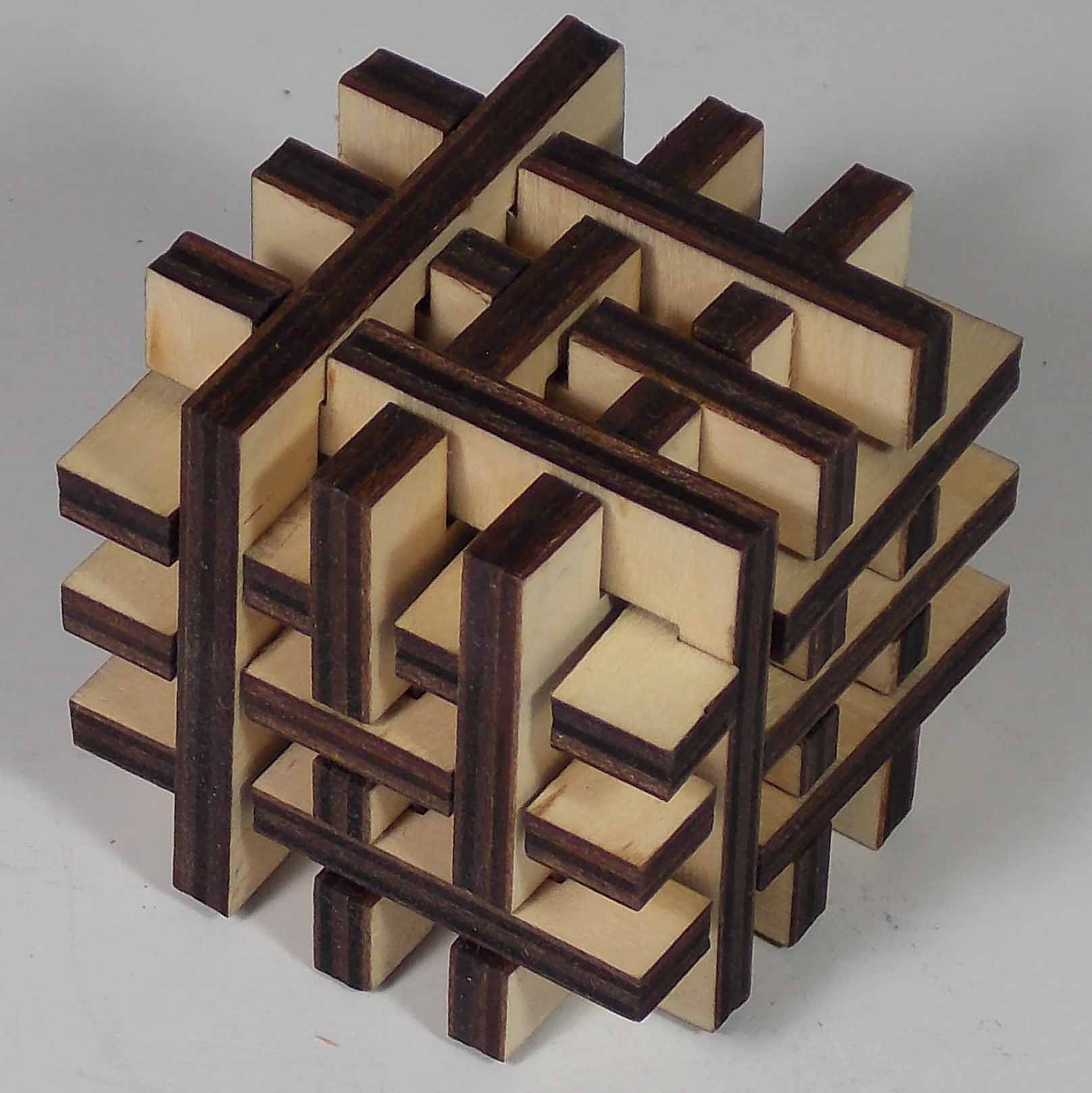 Nine Piece Laser Cube | Derek Corbin | 9 wood pieces make a cube with 4x4 tic-tac-toe look on edges |