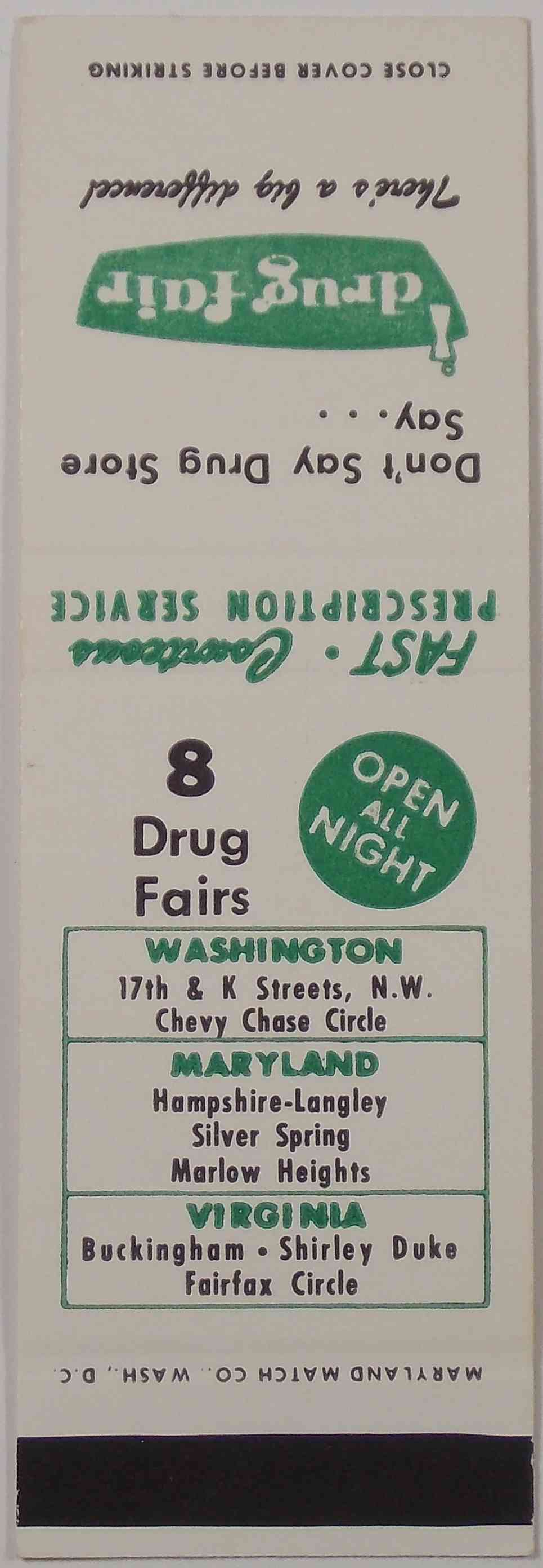 This matchbook cover is similar to the one above, but it says there are 8 Drug Fairs instead of 3.