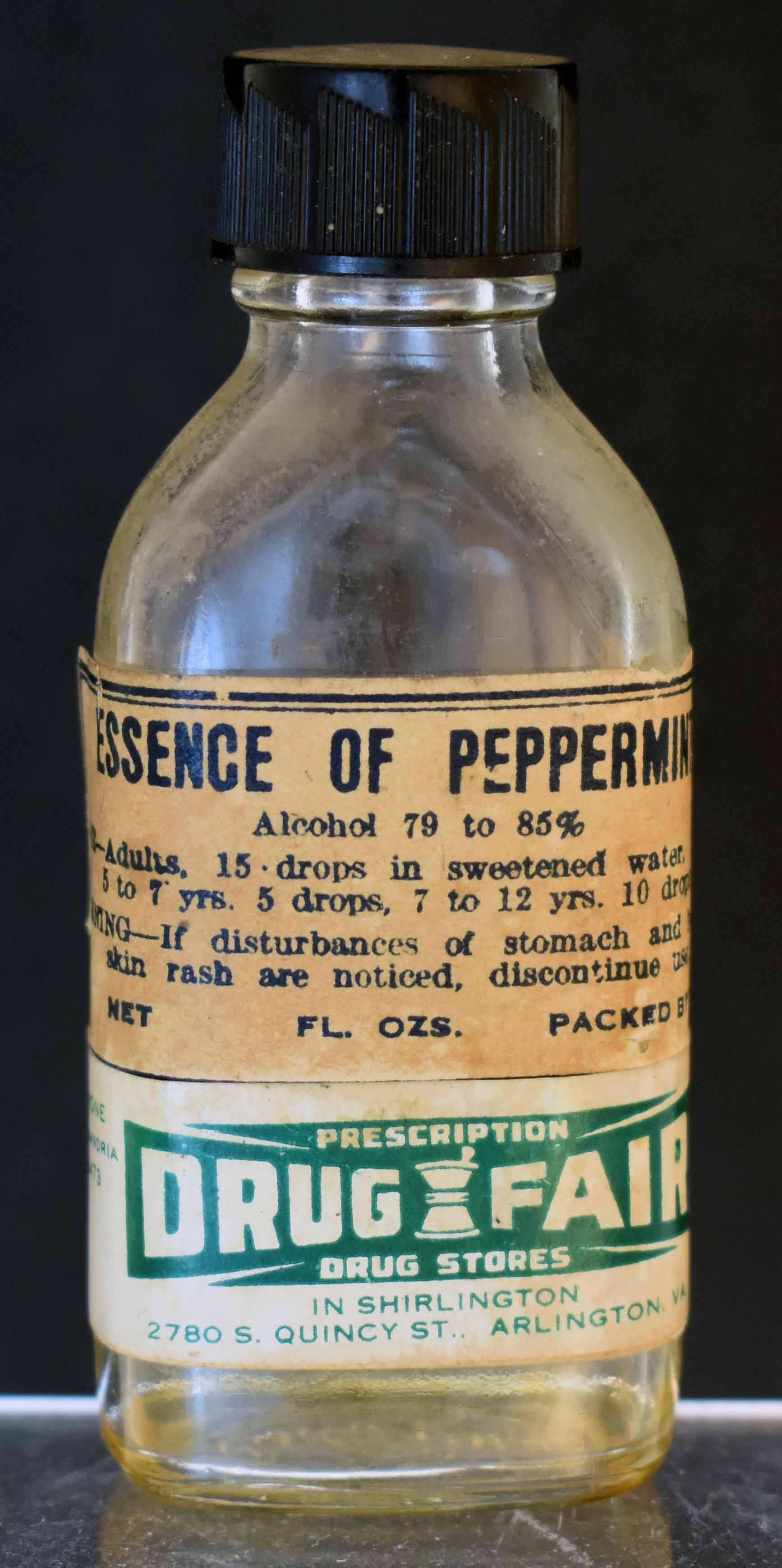 label: ESSENCE OF PEPPERMENT / Alcohol 79 to 85% / ... / PRESCRIPTION / DRUG FAIR / DRUG STORES /