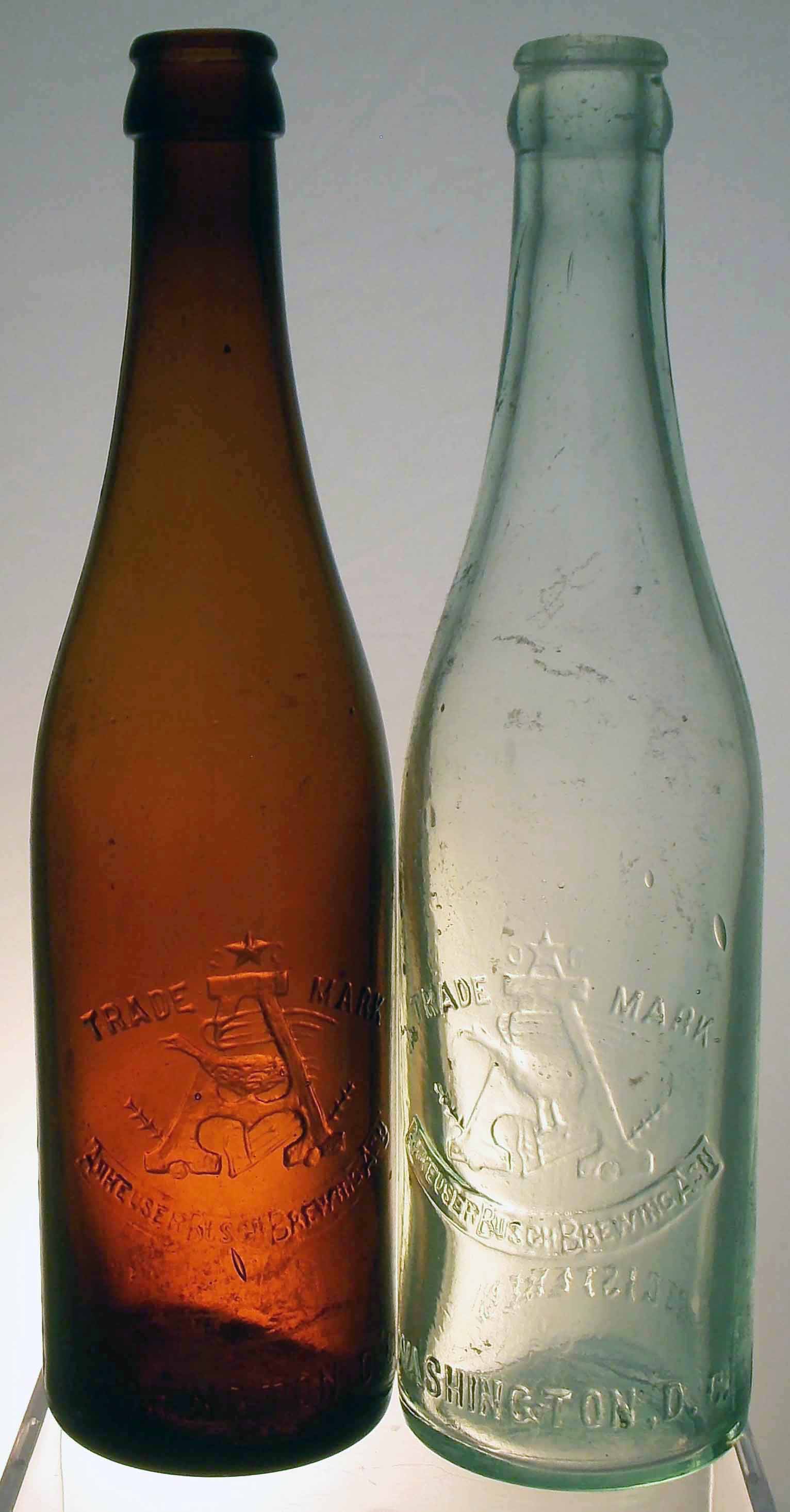 book # 23 These are 9.75" BIM crown top bottles. The left is amber and the right is aqua. They are both embossed: front: TRADE MARK / (eagle inside letter 'A') / ANHEUSER BUSCH BREWING ASN front heel: WASHINGTON, D.C. back heel: REGISTERED base: OB CO / 1088 / 2 |