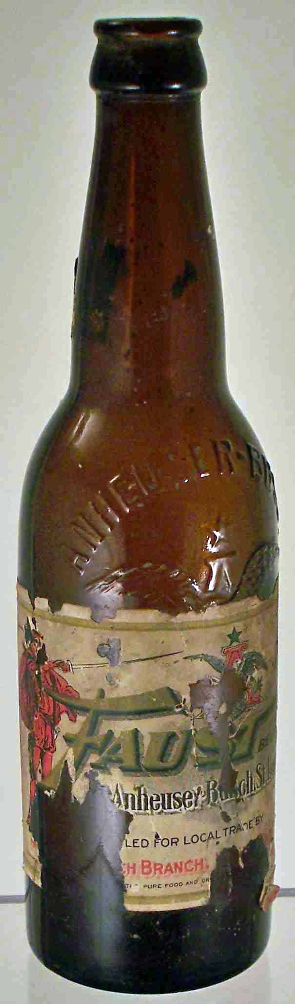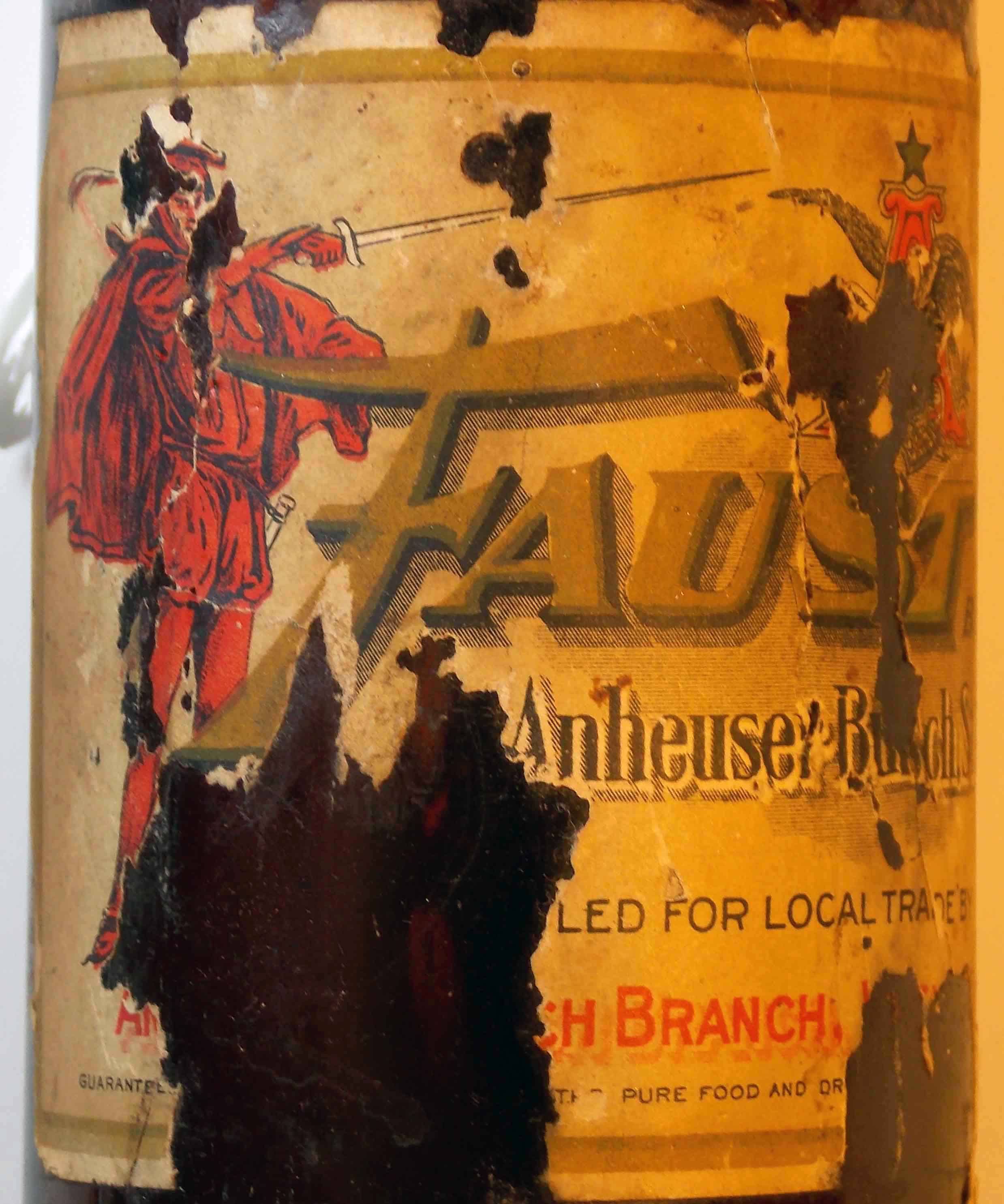 book # 26 This is a close-up of the label from the bottle above. It says: label left:(picture of swordsman in red suit with cape) label right:(picture of eagle inside letter A) label center:FAUST BEER / Anheuser Busch, St. Louis / BOTTLED FOR LOCAL TRADE BY / ANHEUSER BUSCH BRANCH, WASHINGTON, D.C / GUARANTEED BY ANHEUSER BUSCH UNDER THE PURE FOOD AND DRUG ACT, JUNE 30th 1906, SERIAL NO ??89 |