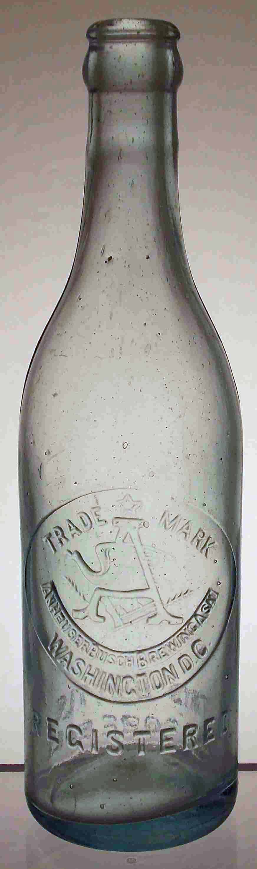 book # 22 This is a 9.5" aqua crown top. It's the only variation I know of from Anheuser Busch in Washington DC that has a slug plate. It's embossed: round slug plate: TRADE MARK / (eagle inside letter 'A') / ANHEUSER BUSCH BREWING ASN / WASHINGTON D.C. below slug plate: REGISTERED rear: THIS BOTTLE / NOT TO BE SOLD |