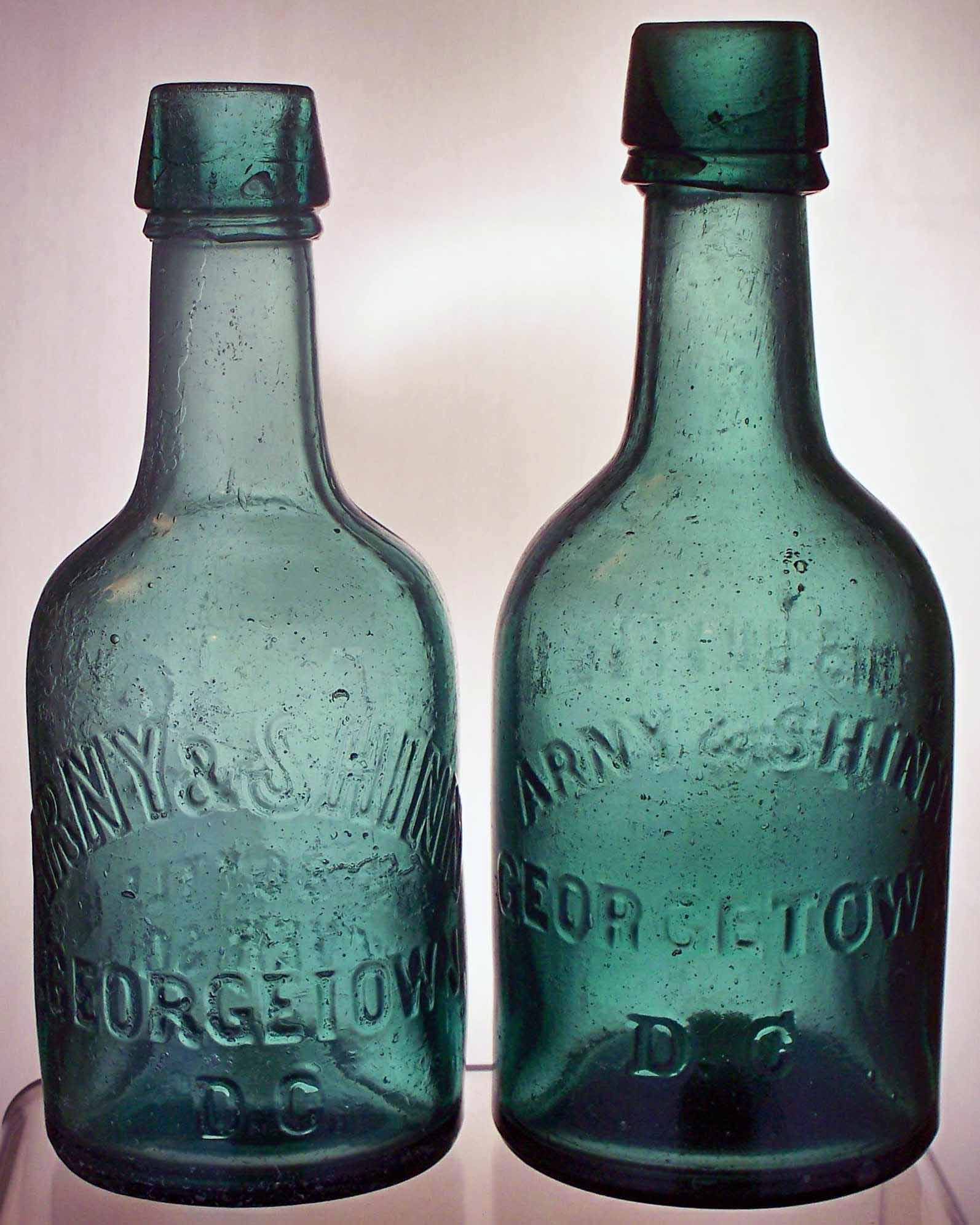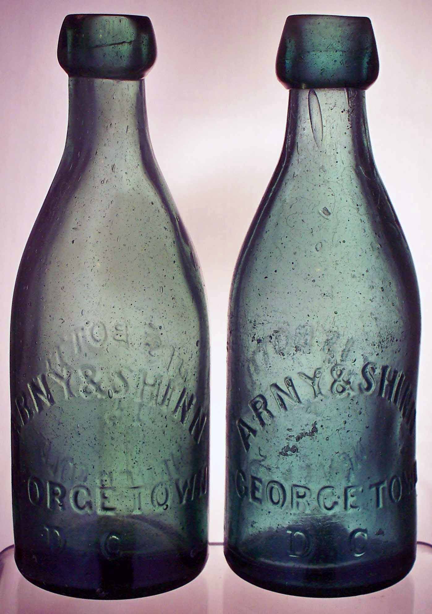 book # 54 These are 7" dark-green short blob top bottles embossed: front: ARNY & SHINN / GEORGETOWN, / D.C. back: THIS BOTTLE / IS / NEVER SOLD They embossing seems identical, but the applied tops have different shapes. |