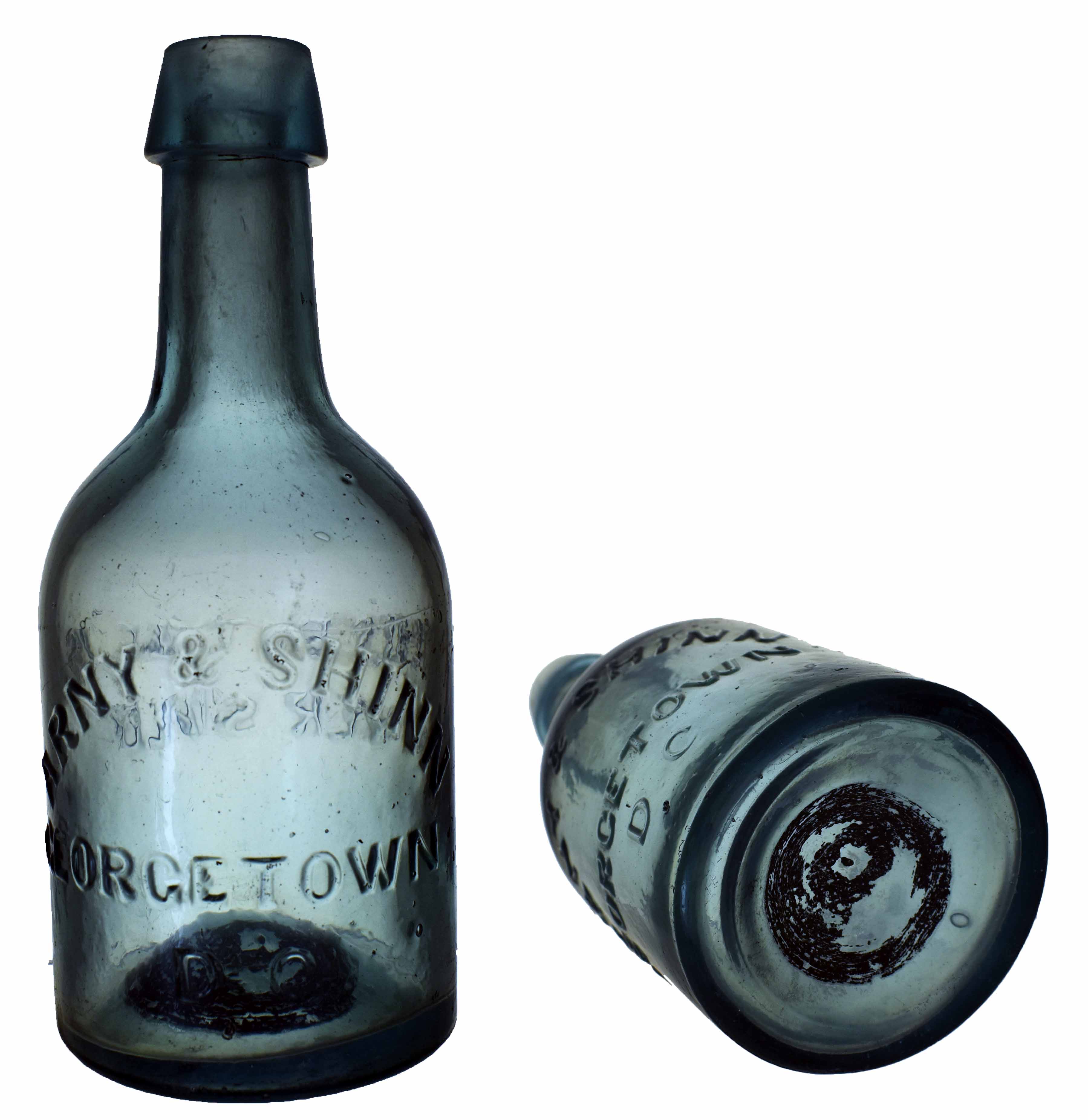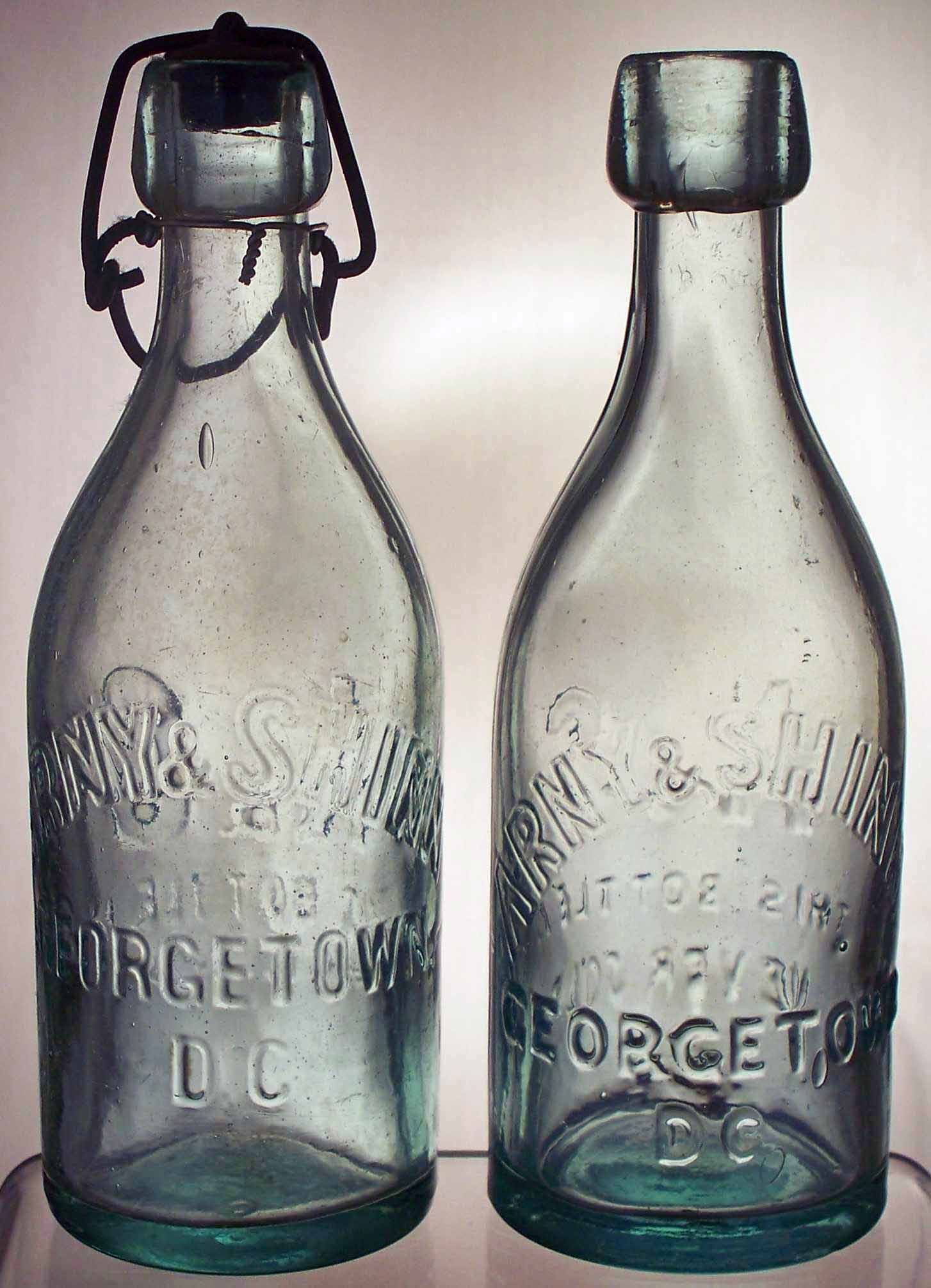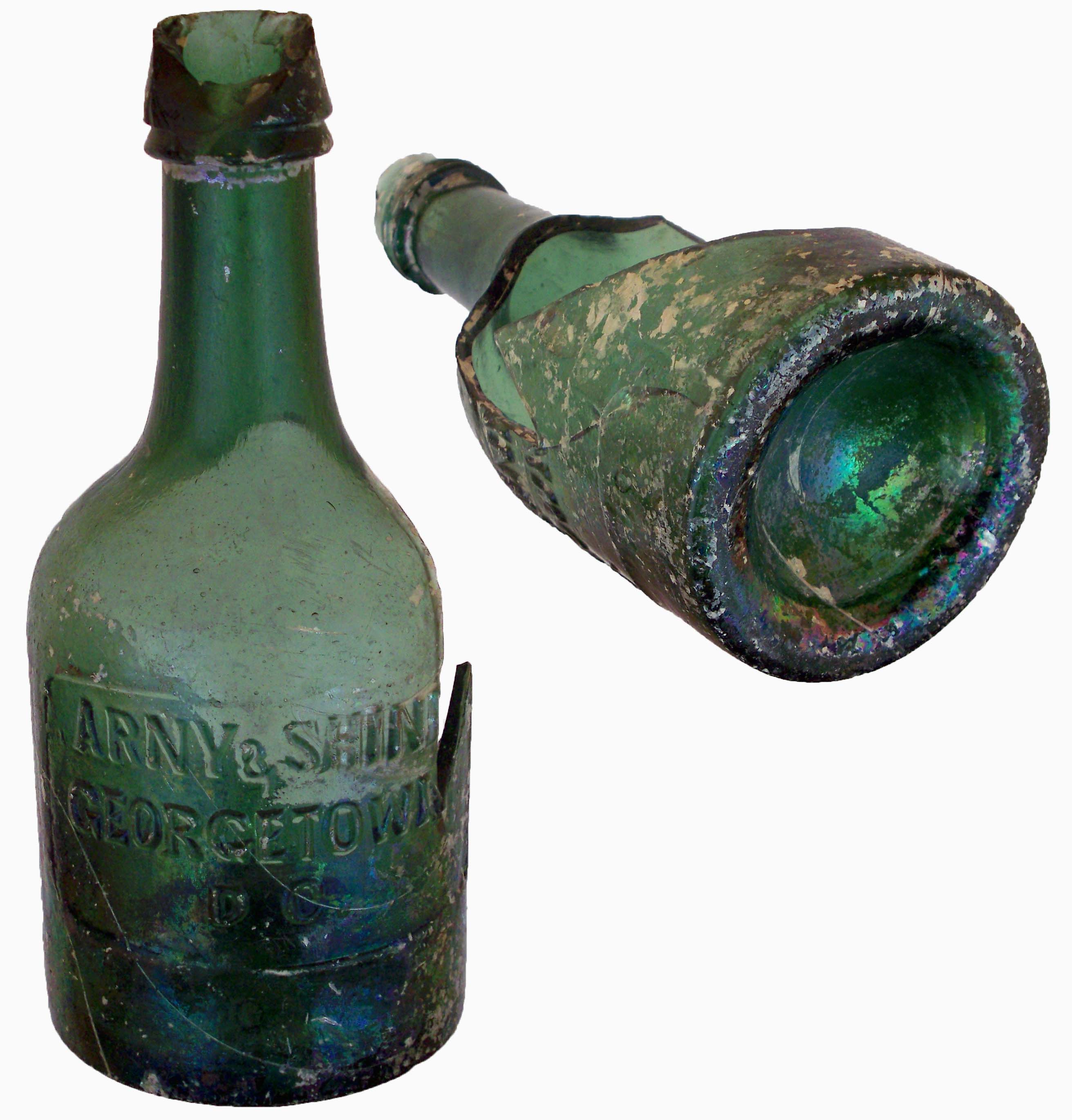 book # 57 This is an aqua, 7.25" squat blob-top bottle (with the top broken off). It is embossed: front: ARNY & SHINN / GEORGETOWN, / D.C. back: THIS BOTTLE IS / NEVER SOLD base: (iron pontil scar) |