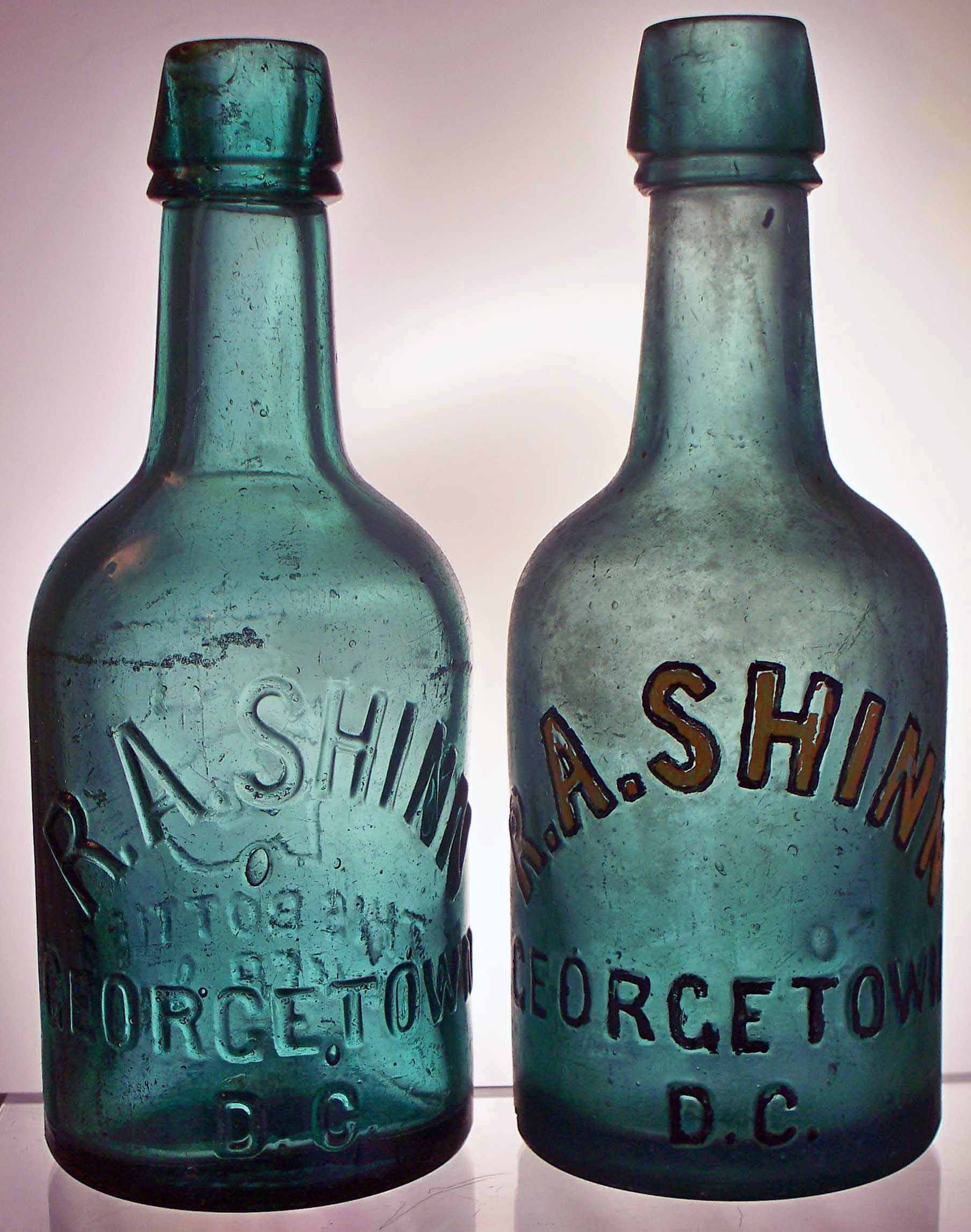 book # 645 The left is a 7" dark green squat bottle. The right is the same except that it's got block letters (which have been painted to show them off). Both bottles are embossed: front: R.A. SHINN / GEORGETOWN / D.C. back: S / THIS BOTTLE IS / NEVER SOLD |