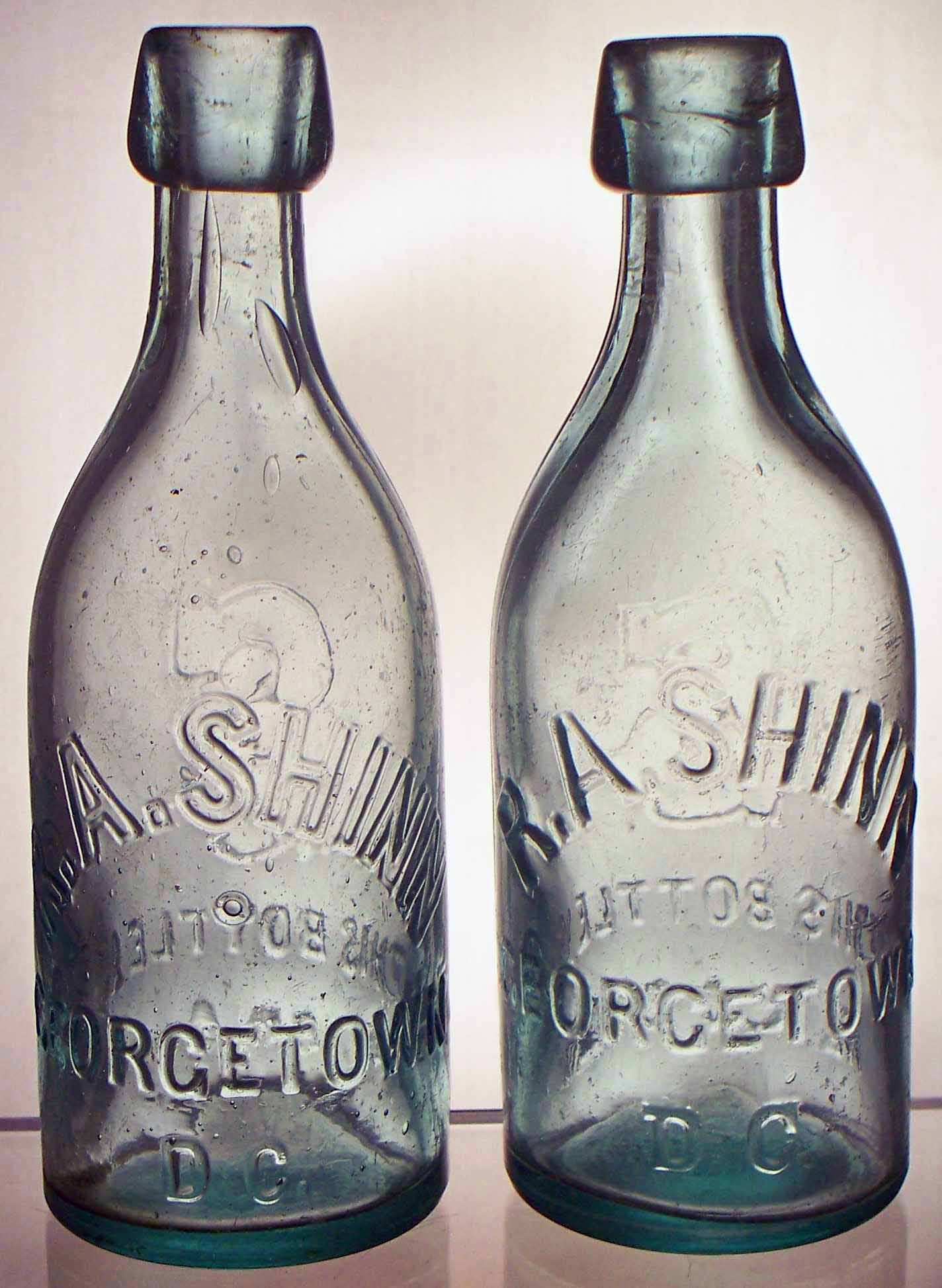 book # 644 The left is a 7.2" aqua blob-top bottle with block letters. The right is the same except that it's got regular letters. Both bottles are embossed: front: R.A. SHINN / GEORGETOWN / D.C. back: S / THIS BOTTLE IS / NEVER SOLD The one on the right has a "2" embossed on the base. |