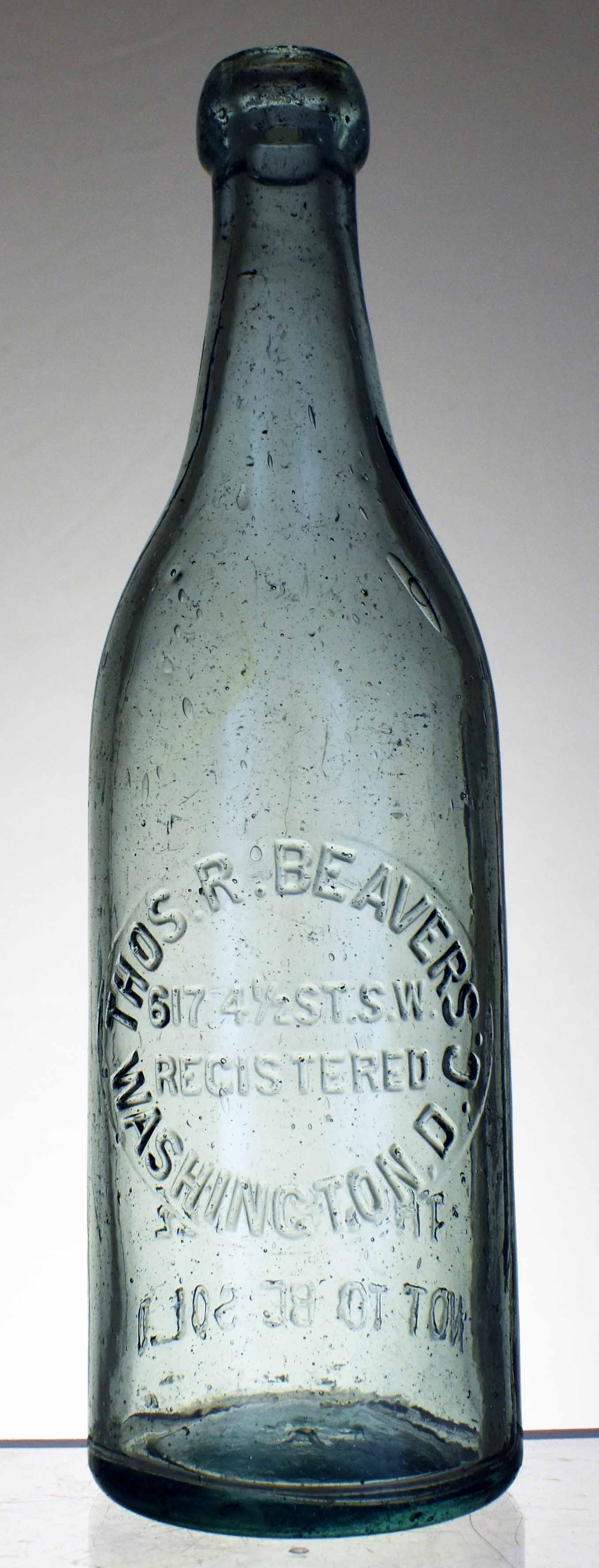 book # 67 This is a 9.3" clear baltimore-loop top bottle embossed: front: THOS. R. BEAVERS / (picture of 2 beavers) / 423 4-1/2 ST. S.W. / WASHINGTON, D.C. back: REGISTERED NOT TO BE SOLD |