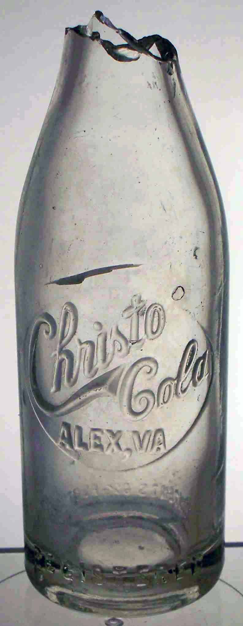 book # (unlisted) This is a shard from what I beleive was about an 8" tall clear crown top bottle. It is embossed: round slugplate: Christo / Cola / ALEX, VA front heel: REGISTERED rear heel: CONTENTS 6 1/2 FL OZS. |
