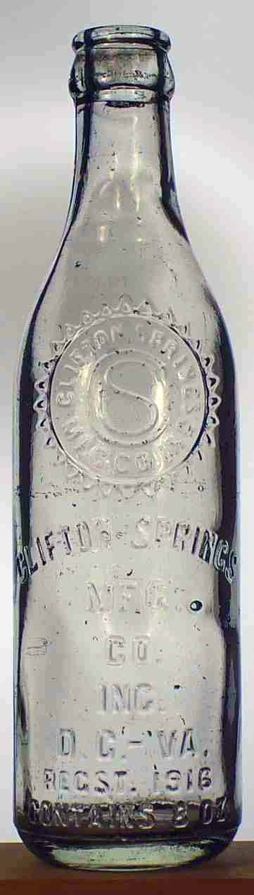 book # 141 This is an 8.5" aqua machine-made crown top, marked: circle on shoulder: CLIFTON SPRINGS / MFG. Co. INC. / "S" inside of a "C" front: CLIFTON SPRINGS / MFG. / CO. / INC. / D.C. - VA. / REGST. 1916 / CONTAINS 8 OZ. back: 776ES base: "S" inside of a "C" |