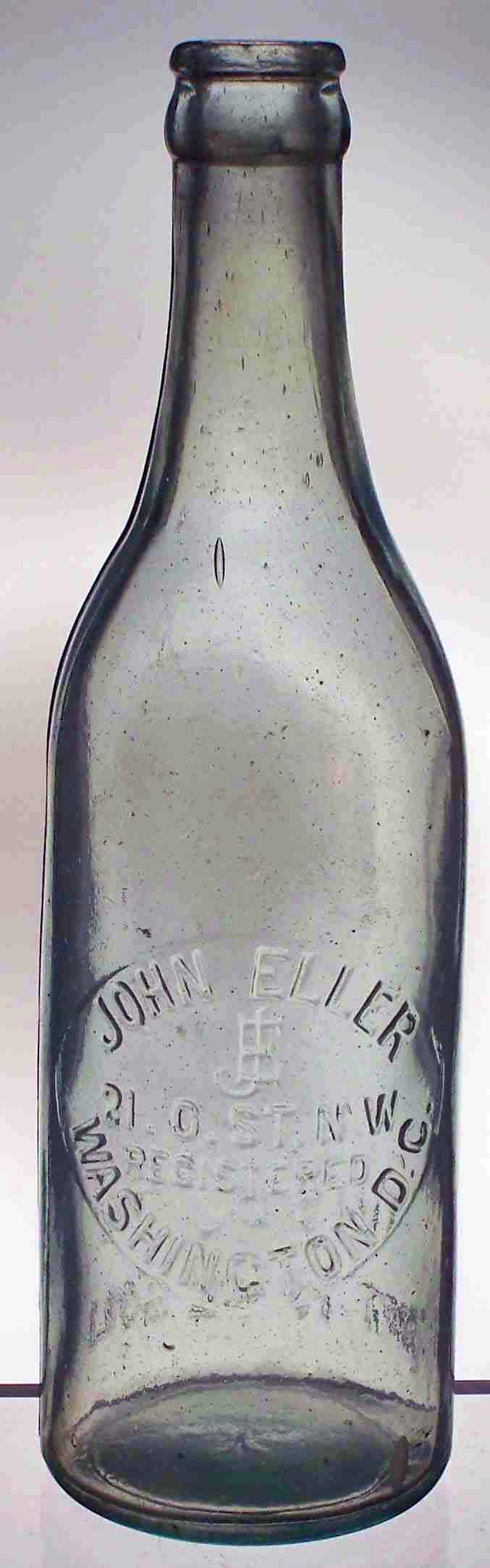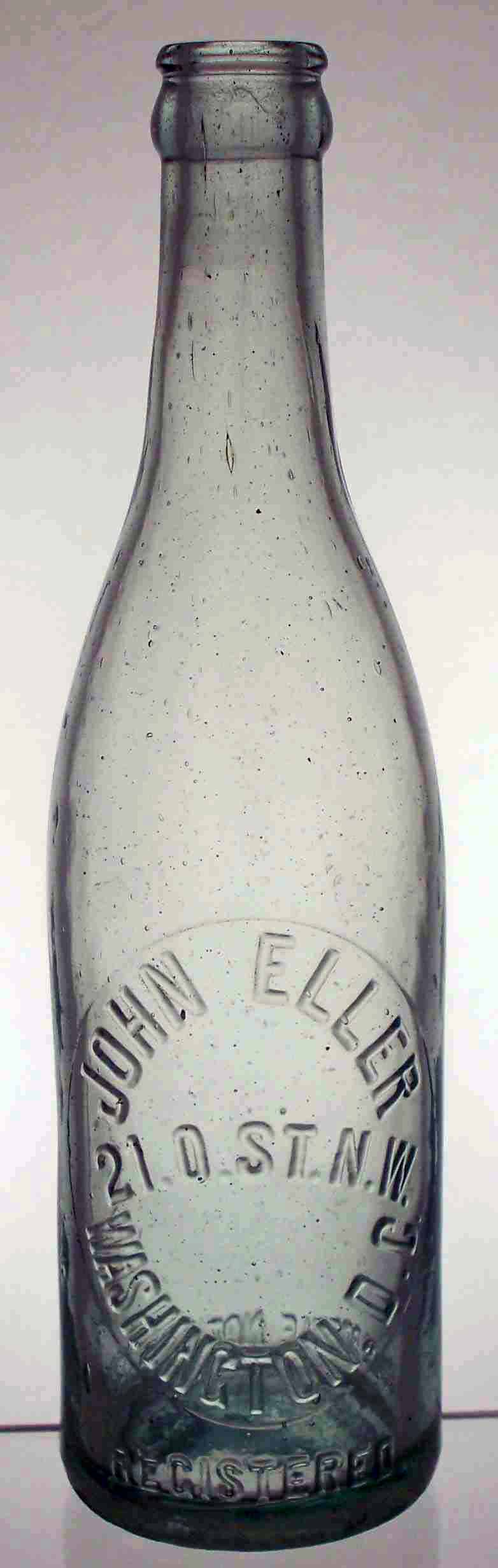 book # 226 This is a 9.25" aqua crown top bottle, embossed: oval slug plate: JOHN ELLER / 21.O.ST.N.W. / REGISTERED / WASHINGTON, D.C. below slug plate: REGISTERED back: THIS BOTTLE NOT TO BE SOLD |