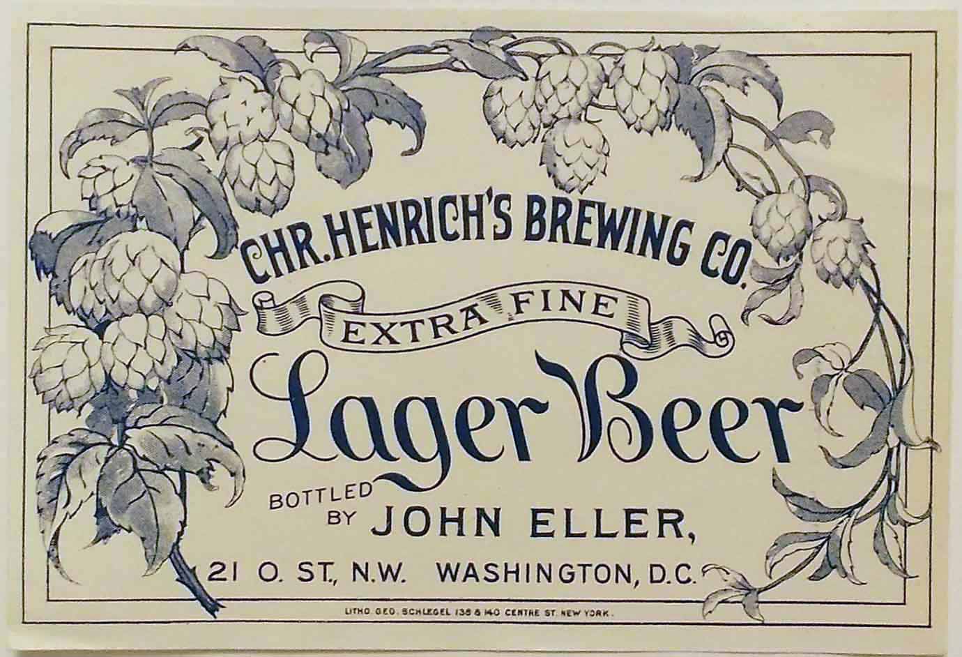 This is a 3.5 x 5 in label that says: label: (picture of vine with hops on it) / CHR. HENRICH'S BREWING CO. / EXTRA FINE / Lager Beer / BOTTLED BY JOHN ELLER, / 21 O. ST., N.W. WASHINGTON D.C. small letters at bottom: LITHO. GEO. SCHLEGEL 136 & 140 CENTRE ST. NEW YORK. Note that Christian Heurich's name is mispelled on this label. |