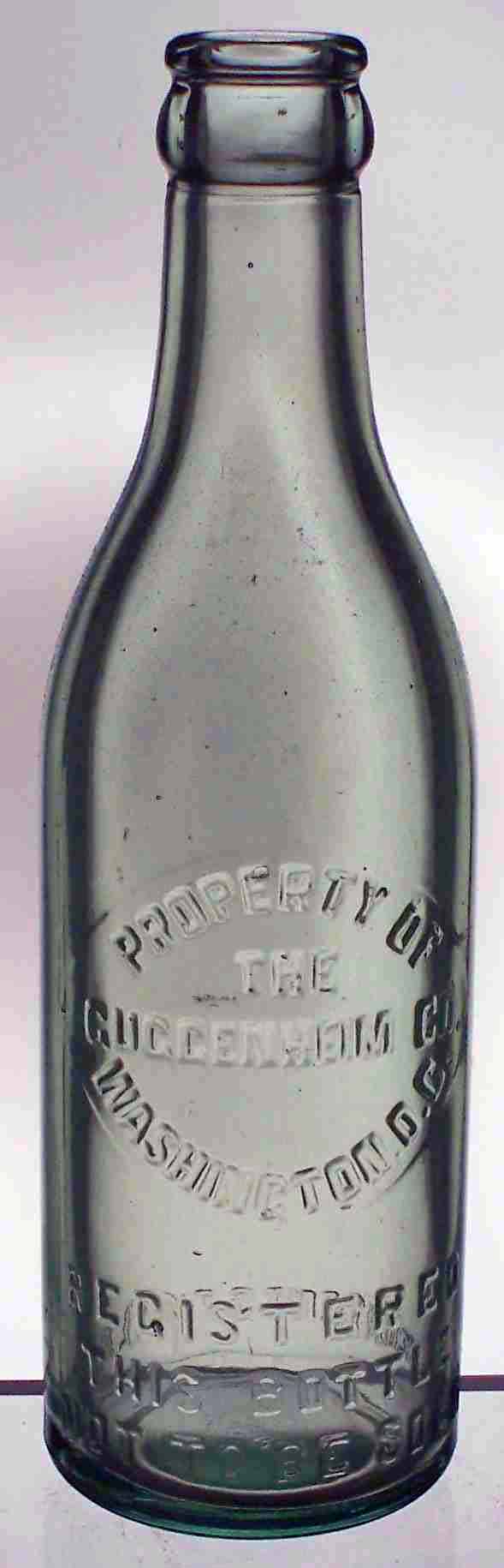 book # 282 This is an 8" aqua machine-made crown top bottle embossed: oval slug plate: PROPERTY OF / THE / GUGGENHEIM CO / WASHINGTON DC below slug plate: REGISTERED / THIS BOTTLE / NOT TO BE SOLD back on heel: CONTENTS 7 1/2 FL OZ. |