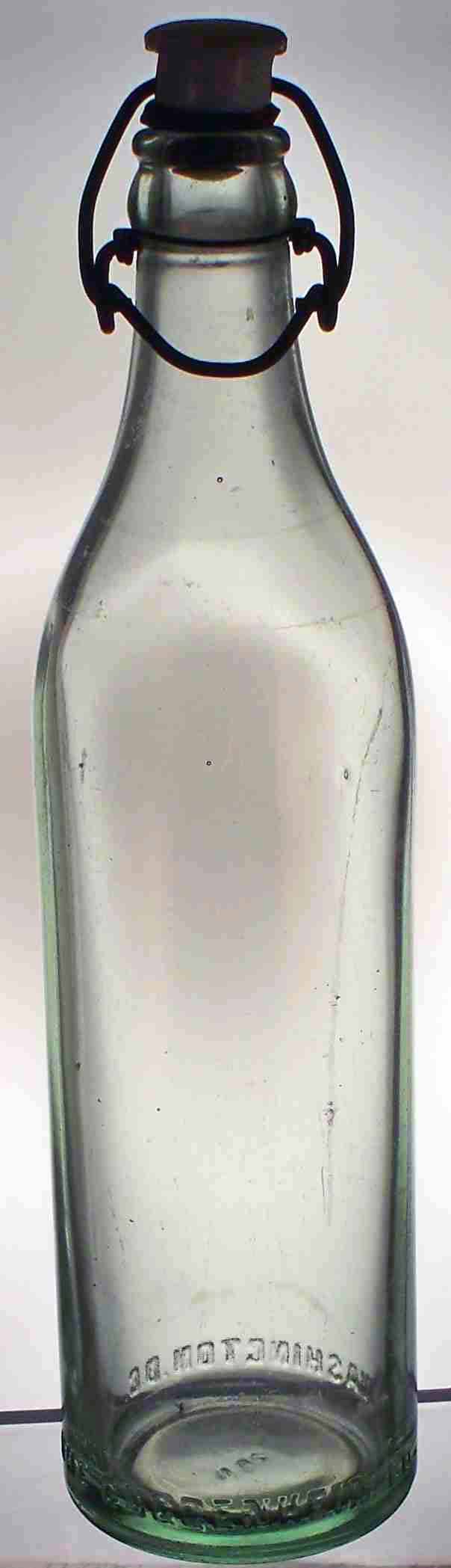 book # 285 This is a 10" aqua machine-made crown top bottle embossed: heel: THE GUGGENHEIM CO. WASHINGTON, D.C. base: 20N The ceramic stopper has no markings on top, but on the bottom it says: FOR / HUTTER / N.Y. / GERMANY |