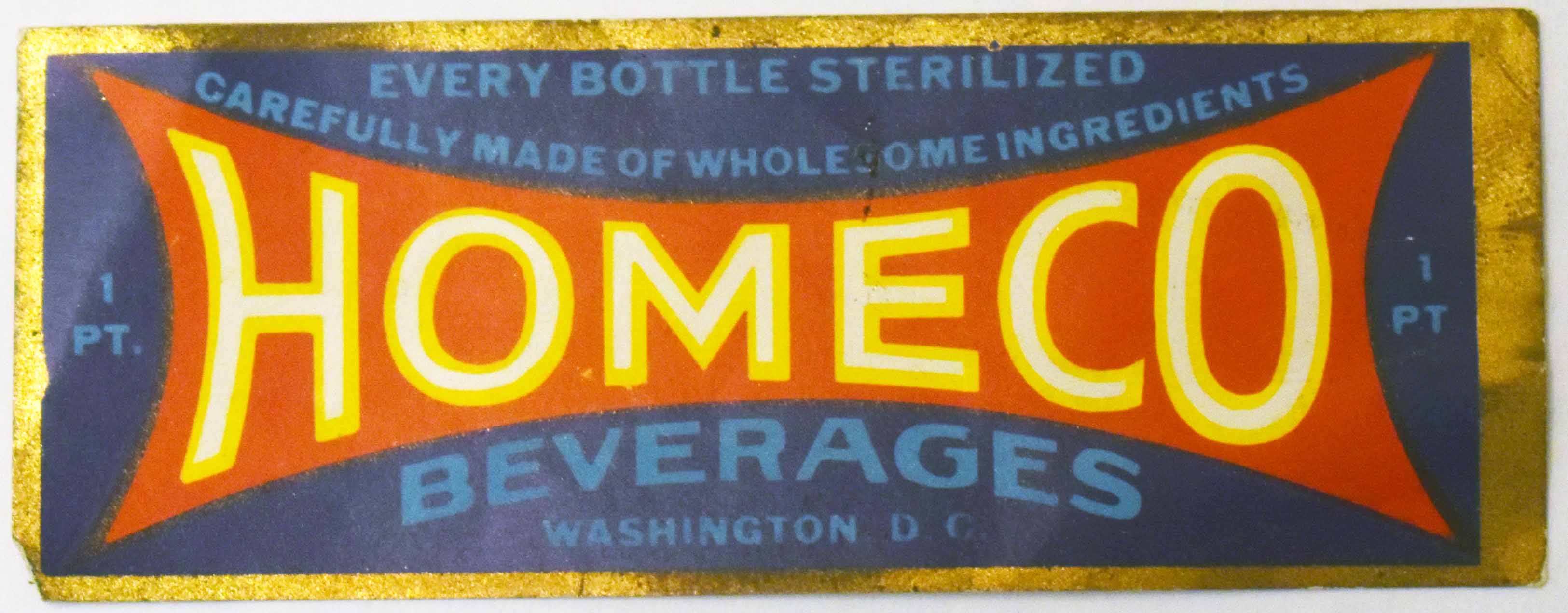 This is a paper label, probably from the neck of a bottle. It says: label: EVERY BOTTLE STERILIZED / CAREFULLY MADE OF WHOLESOME INGREDIENTS / HOMECO 1 PT. / BEVERAGES / WASHINGTON D.C. |