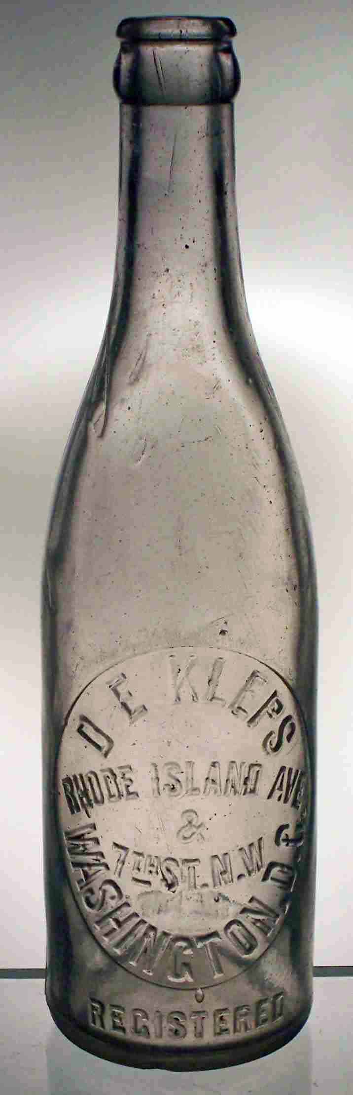 book # 351 Sun-colored-Amethyst 9.5" crown top bottle embossed: oval slugplate: D.E. KLEPS / RHODE ISLAND AVE. / & / 7TH ST. N.W. / WASHINGTON, D.C. front below slugplate: REGISTERED back: THIS BOTTLE NOT TO BE SOLD |