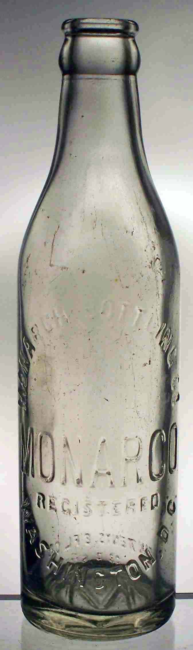 book # 418 This is an 8.3" clear machine-made crown top bottle embossed: front: MONARCH BOTTLING CO / MONARCO / REGISTERED / WASHINGTON, D.C. back: CONTENTS 8 FL OZS base: M |
