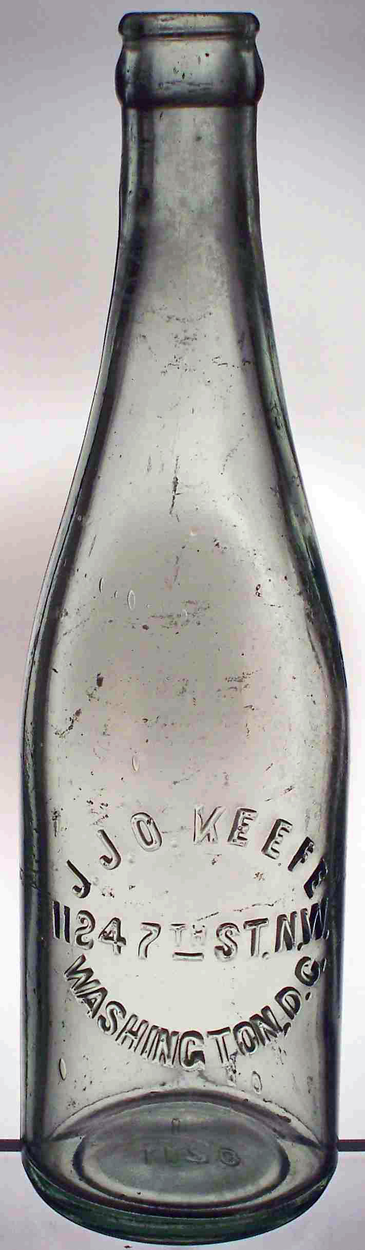 book # 457 This is an aqua 9.75" BIM crown top bottle embossed: circular pattern: J.J. O.KEEFE / 1124 7TH ST. N.W. / WASHINGTON, D.C. back: O B Co base: 1170 / 1 Note that there is a period between the 'O' and the 'K', not an apostrophe. I'm pretty sure that was a mistake. |