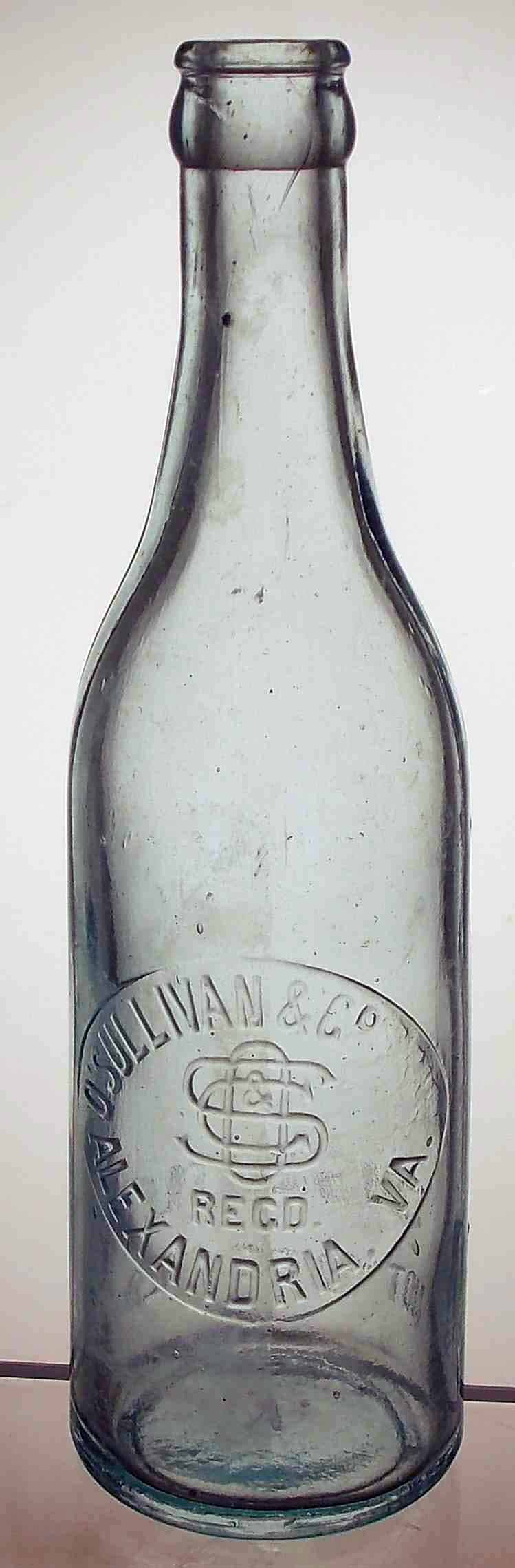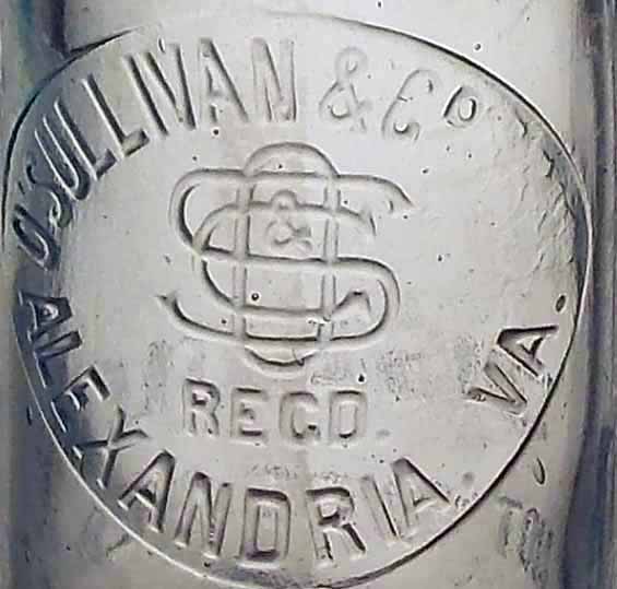 book # 467 This is a 9" aqua crown-top bottle embossed: round slugplate: O'SULLIVAN & Co / ('OS&G' logo) / REGD / ALEXANDRIA, VA. below slugplate: THIS BOTTLE / NOT TO BE SOLD base: V It appears this bottle used the a modified version of an "O'SULLIVAN & GREENE" slugplate - the word "GREENE" was peened out, except that they made the "G" into a "C" and the "R" into a raised "o" - see the close-up: