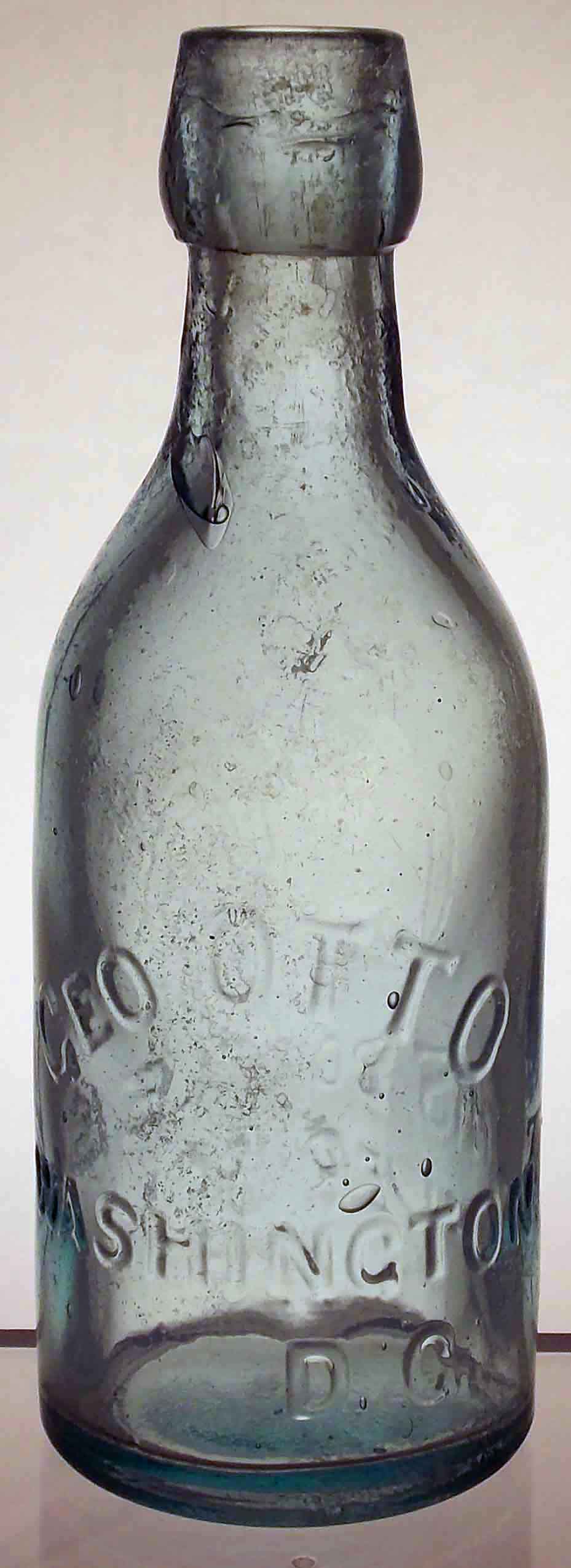 book # 469 This is similar to the bottle above, except it's shorter (7") and has a different shaped blob top. It is embossed: front: GEO. OTTO / WASHINGTON / D.C. back: G O / THIS BOTTLE IS / NEVER SOLD |