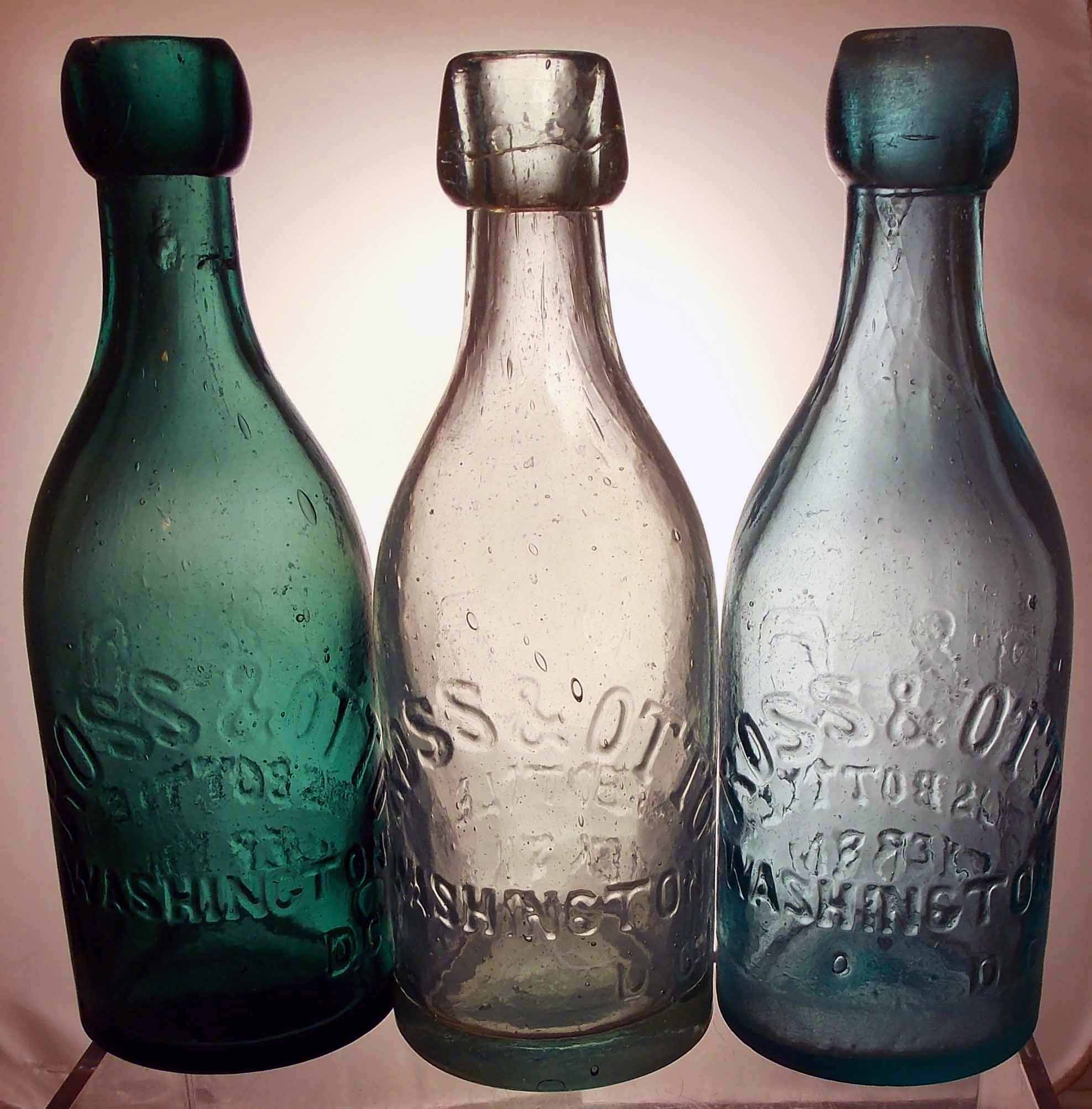 book # 612 These 3 short-blob bottles are different colors, but they're all about 7" tall and embossed the same. From left to right, they are dark green, aqua, and blue/aqua. They are embossed: front: ROSS & OTTO / WASHINGTON / D C back: R&O / THIS BOTTLE IS / NEVER SOLD |