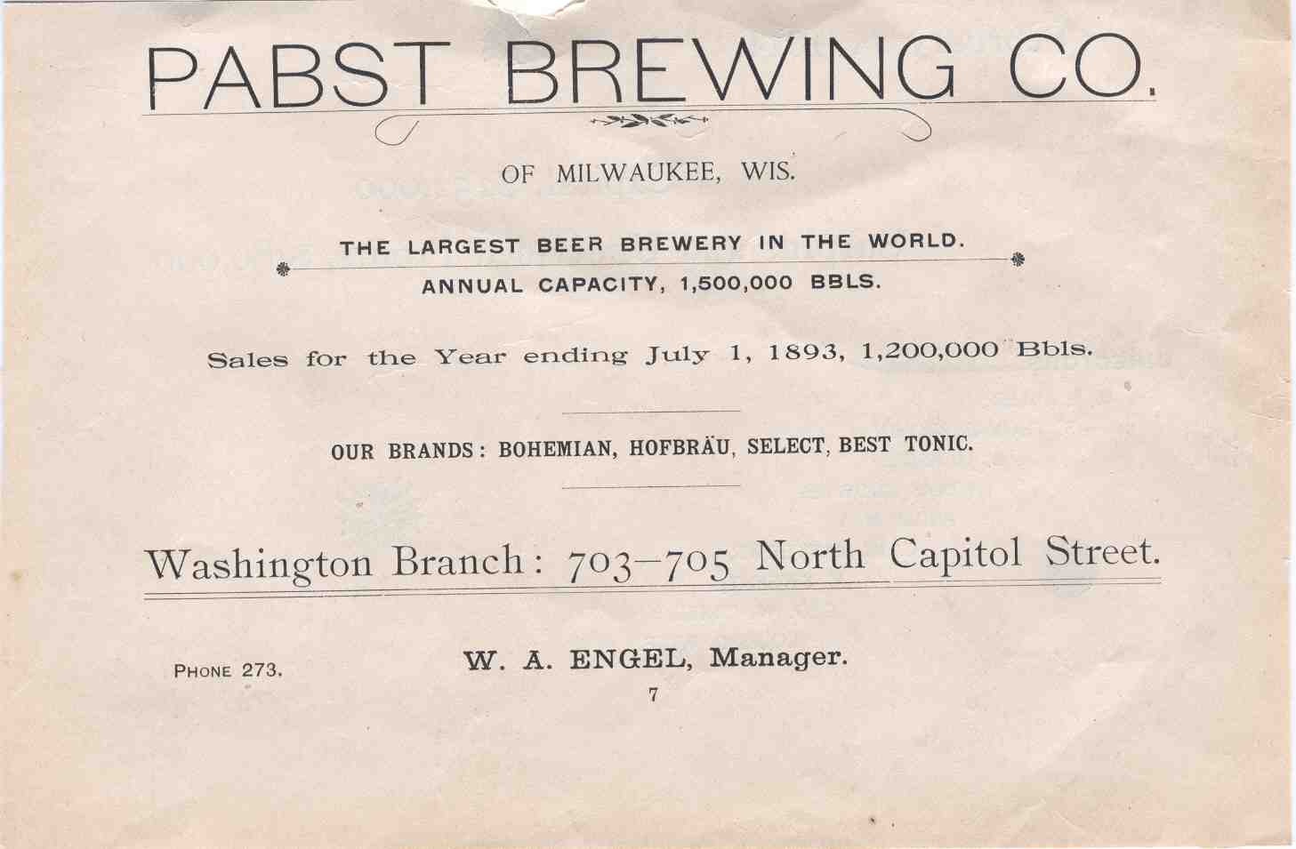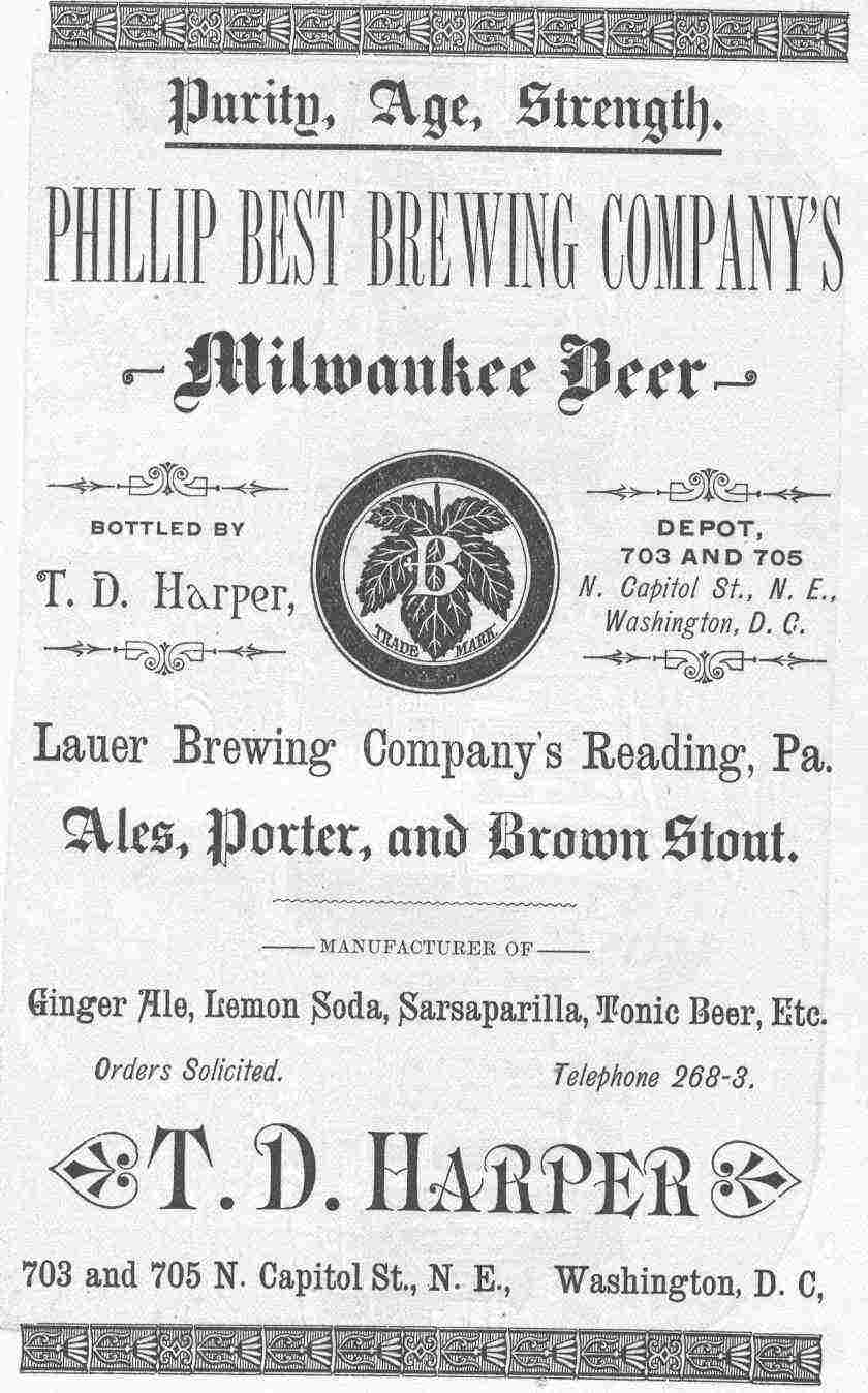 Company Names, addresses, dates1:   Raedy & Walsh , 703-705 N Capitol (1886-1887)   Thomas D. Harper , 703-705 N Capitol (1887-1889)   Philip Best Brewing Co, 701 N Capitol (1887-1889)   Pabst Brewing Co, 703-705 N Capitol (1890-1917) |