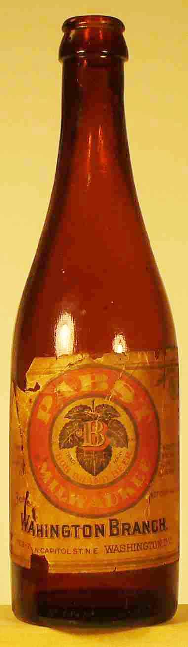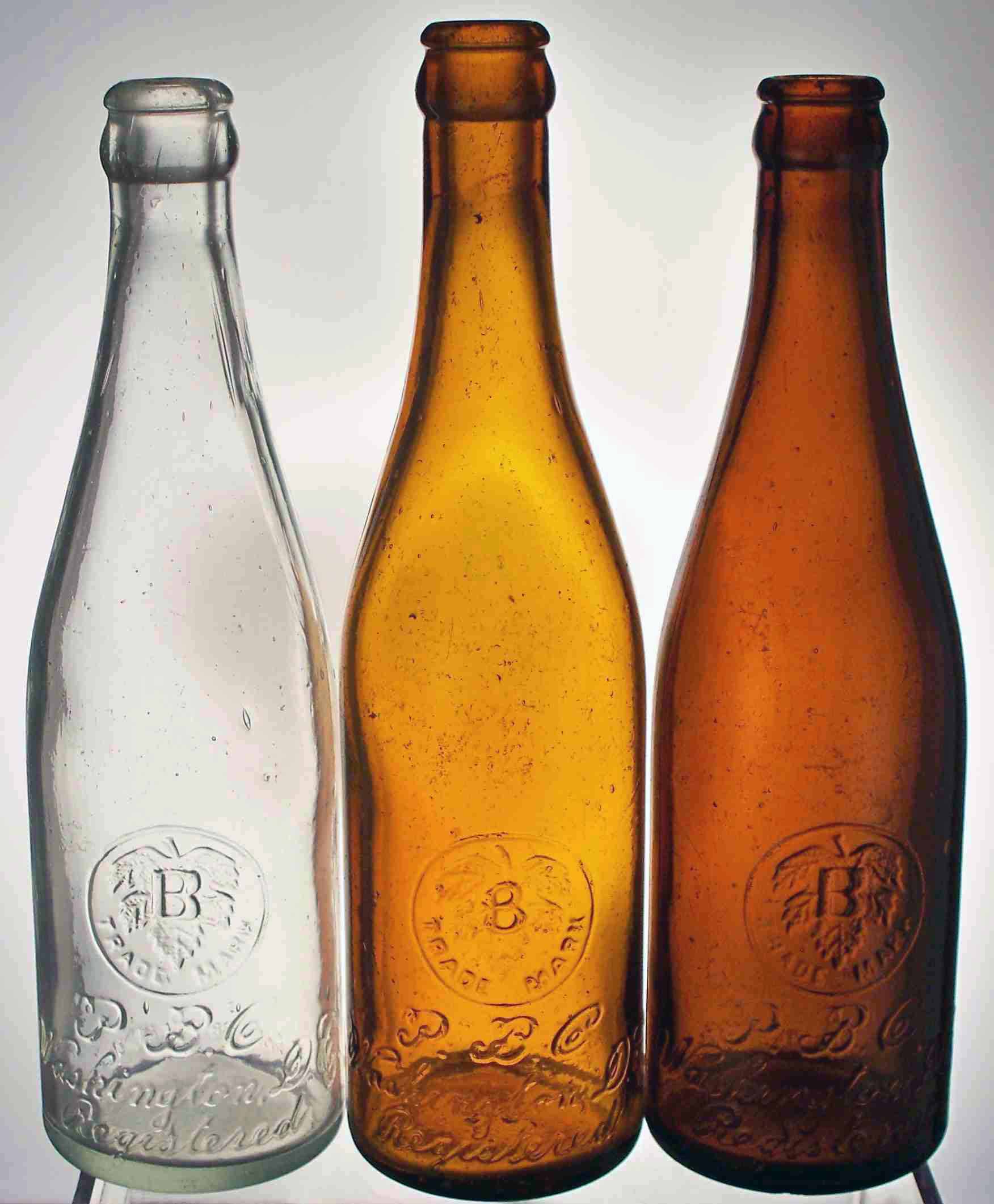 book # 484 These are BIM crown-top bottles. The left one is 9.25" aqua, the center is 9.5" light-amber, and the right is 9.25" dark amber. They are all 3 embossed: in circle: ('B' superimposed over a hops leaf) / TRADE MARK below circle in script: P. B. Co. / Washington, D.C. / Registered back: JOHN BRO'S.F.W.VA |