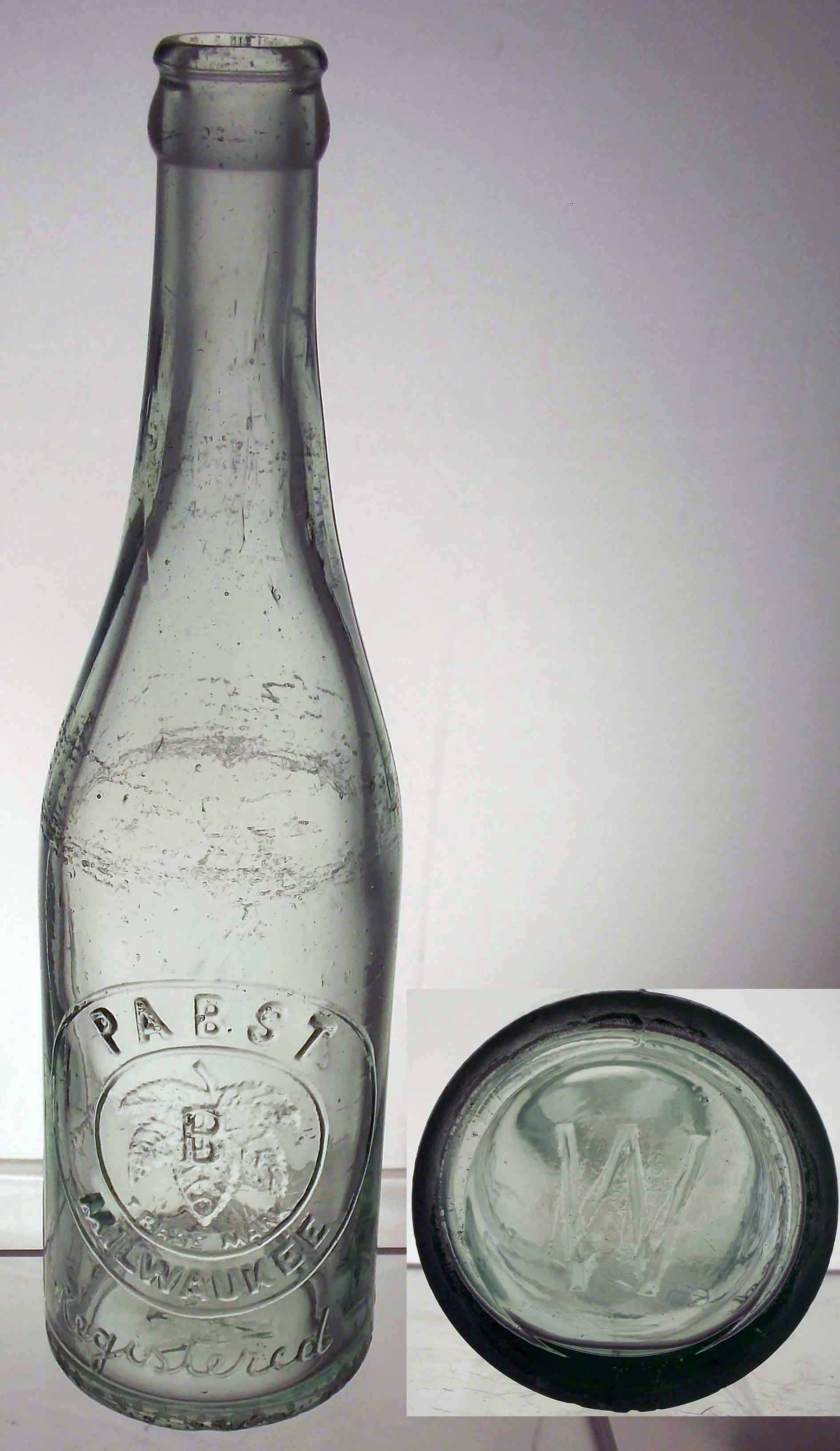 book # (not applicable) This is an 9.7" aqua crown top bottle embossed: round slug plate: PABST / ('B' inside hops leaf) / TRADE MARK / MILWAUKEE below slug plate in script: Registered rear heel: EHE CO base: W. |