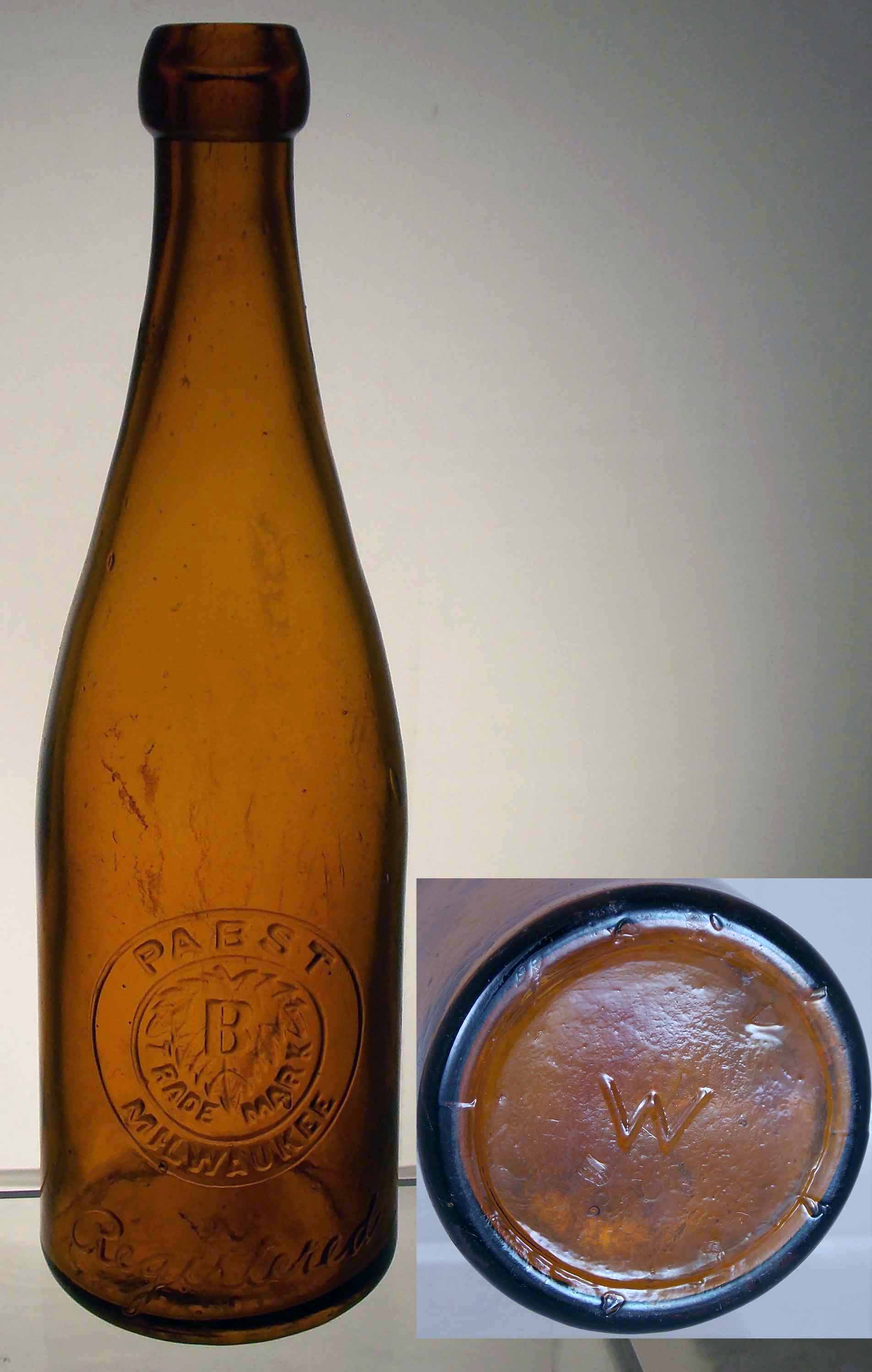 book # (not applicable) This is an 9.25" amber baltimore-loop top bottle embossed: round slug plate: PABST / ('B' inside hops leaf) / TRADE MARK / MILWAUKEE below slug plate in script: Registered base: W |