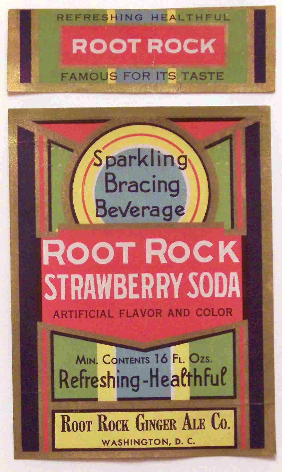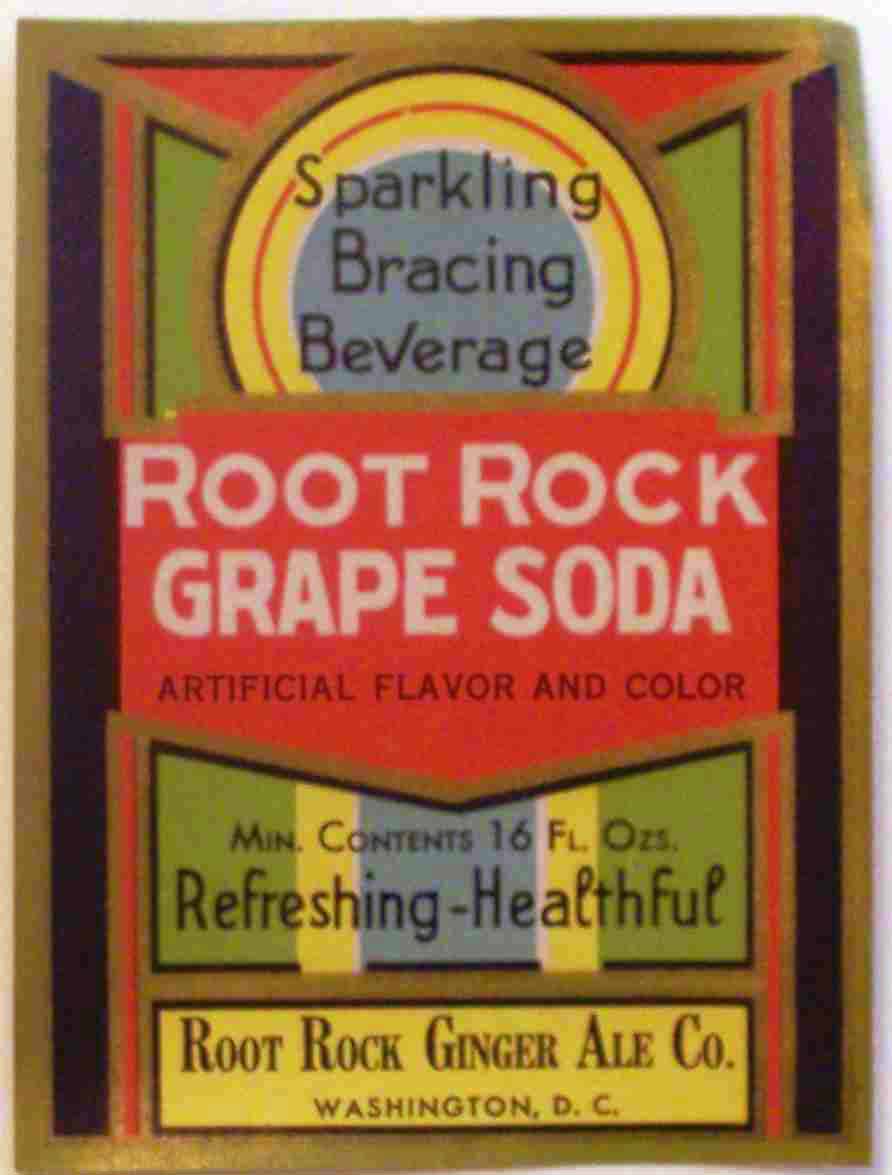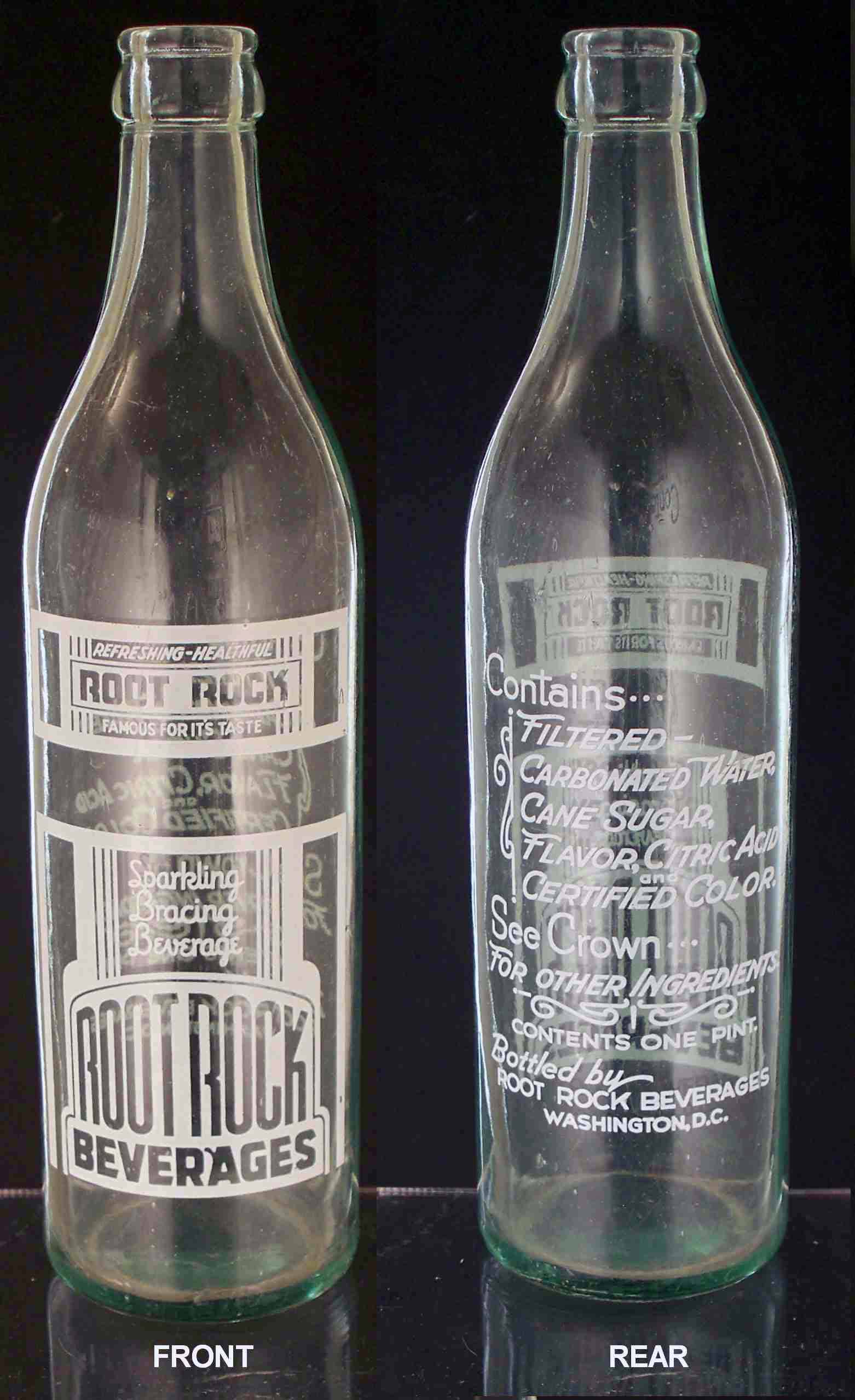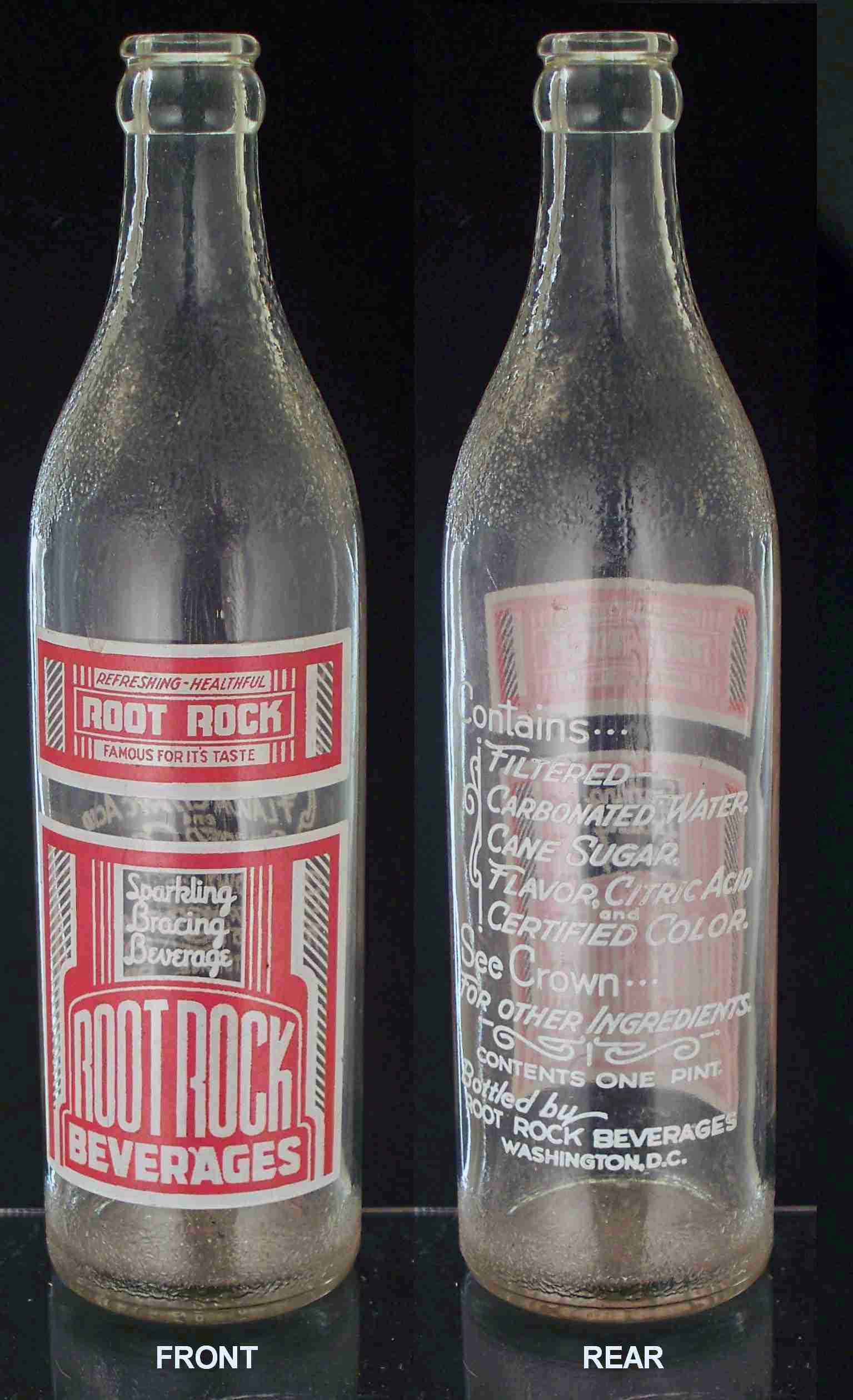 book # 603 This is similar to the above bottle, except that it is not stipled, and the markings are all white with no red. It is a 10" aqua crown top bottle with a white ACL: front: REFRESHING-HEALTHFUL / ROOT ROCK / FAMOUS FOR IT'S TASTE / Sparkling / Bracing / Beverage / ROOT ROCK / BEVERAGES back: Contains / FILTERED / CARBONATED WATER / CANE SUGAR / FLAVOR, CITRIC ACID / CERTIFIED COLOR / SEE CROWN / FOR OTHER INGREDIENTS. / CONTENTS ONE PINT / BOTTLED BY / ROOT ROCK BEVERAGES / WASHINGTON, D.C. |