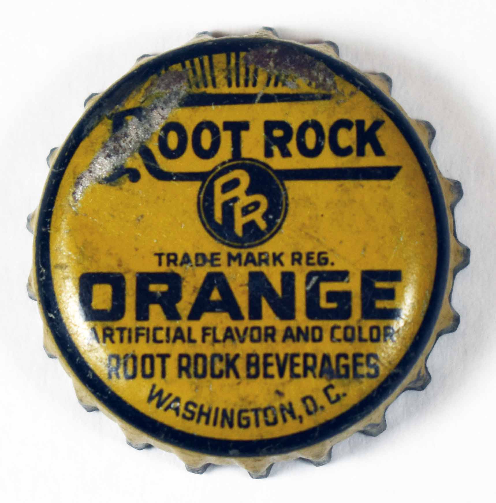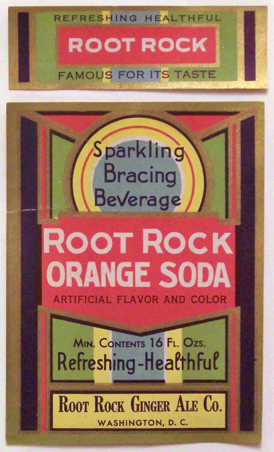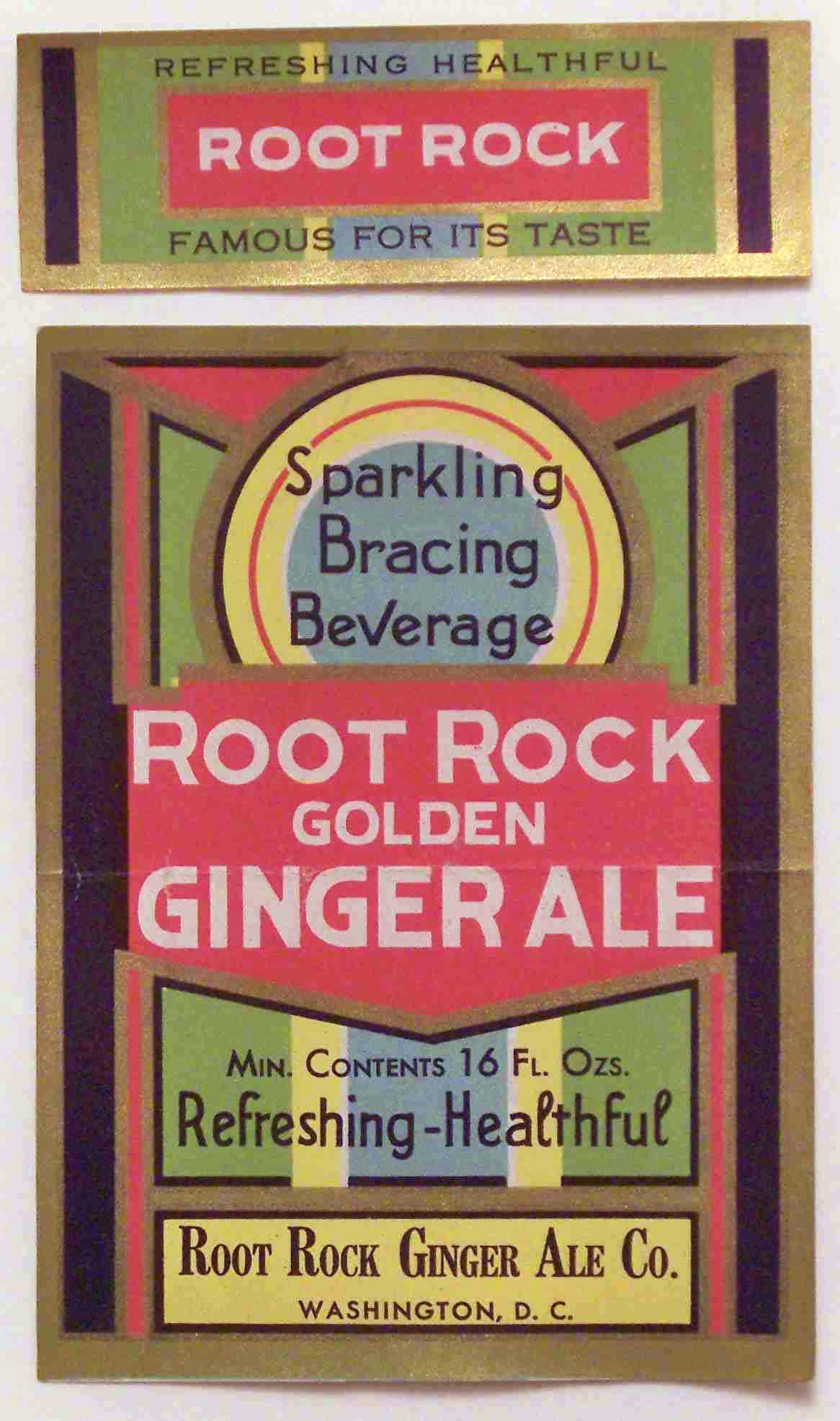 book # 603 This is similar to the above bottle, except that it is not stipled, and the markings are all white with no red. It is a 10" aqua crown top bottle with a white ACL: front: REFRESHING-HEALTHFUL / ROOT ROCK / FAMOUS FOR IT'S TASTE / Sparkling / Bracing / Beverage / ROOT ROCK / BEVERAGES back: Contains / FILTERED / CARBONATED WATER / CANE SUGAR / FLAVOR, CITRIC ACID / CERTIFIED COLOR / SEE CROWN / FOR OTHER INGREDIENTS. / CONTENTS ONE PINT / BOTTLED BY / ROOT ROCK BEVERAGES / WASHINGTON, D.C. |