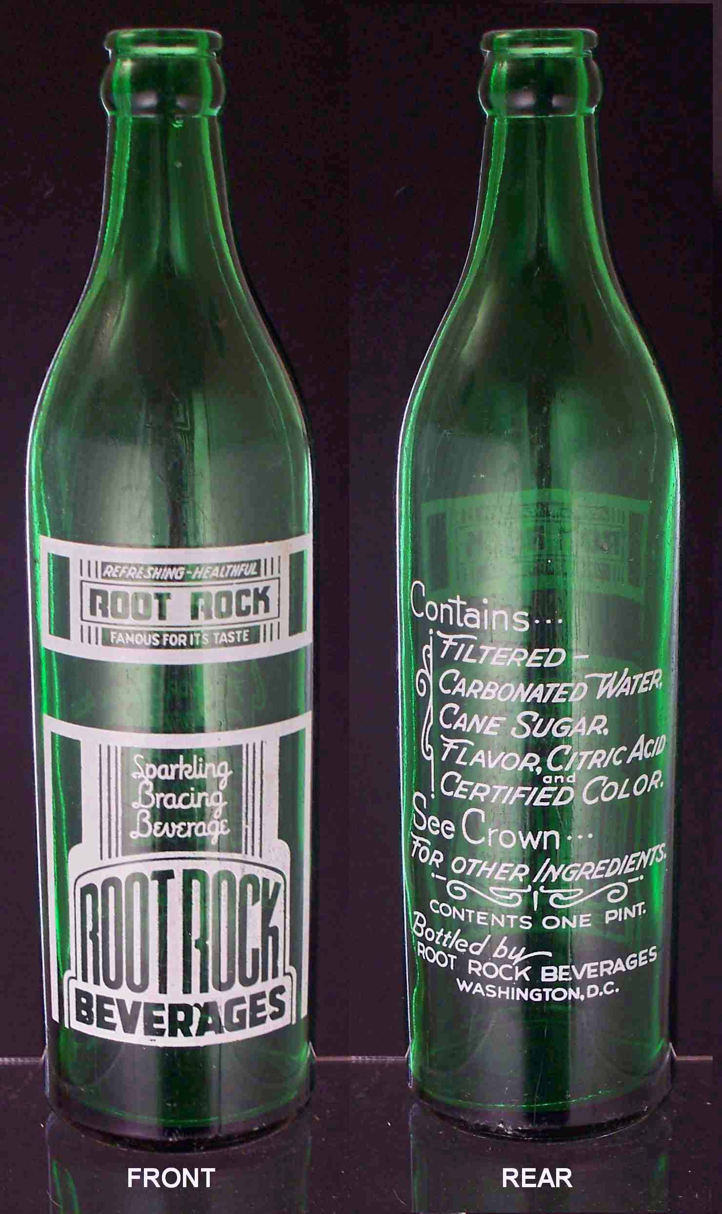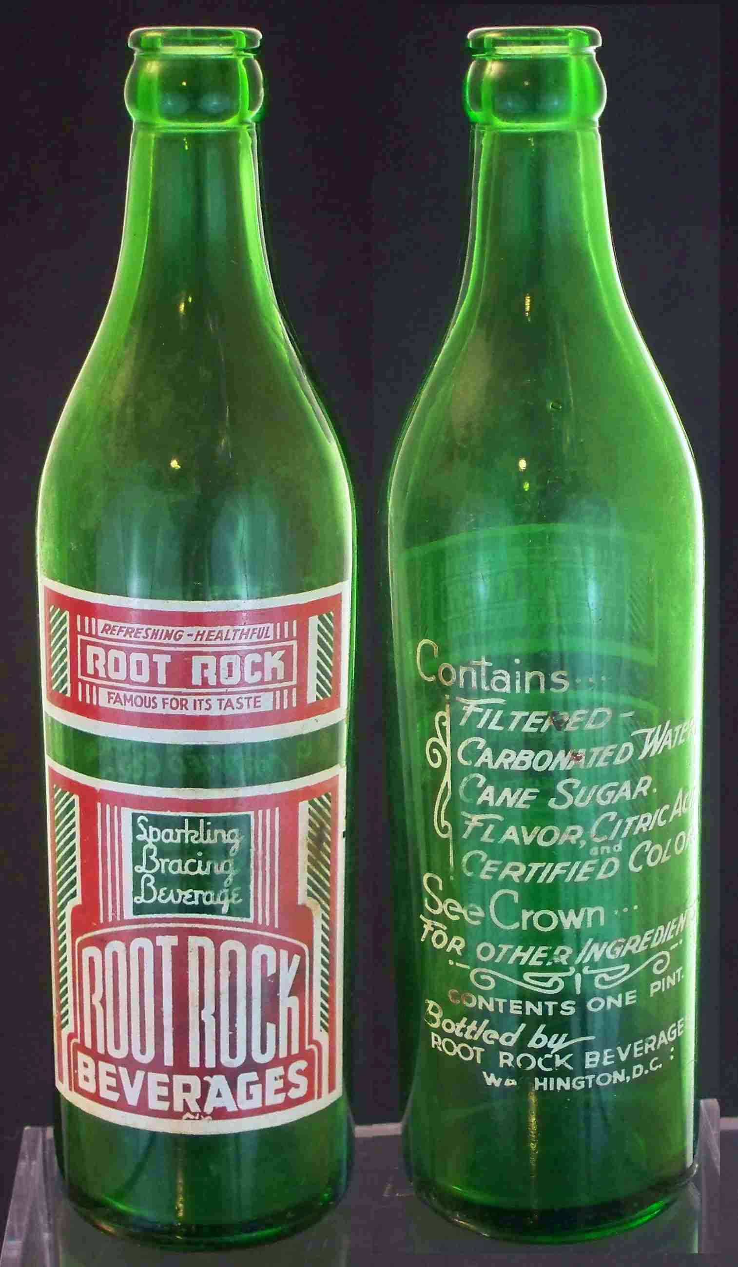 book # 603 This is similar to the above bottle, except the color of the glass is green. It is a 10" green crown top bottle with a white ACL: front: REFRESHING-HEALTHFUL / ROOT ROCK / FAMOUS FOR IT'S TASTE / Sparkling / Bracing / Beverage / ROOT ROCK / BEVERAGES back: Contains / FILTERED / CARBONATED WATER / CANE SUGAR / FLAVOR, CITRIC ACID / CERTIFIED COLOR / SEE CROWN / FOR OTHER INGREDIENTS. / CONTENTS ONE PINT / BOTTLED BY / ROOT ROCK BEVERAGES / WASHINGTON, D.C. |