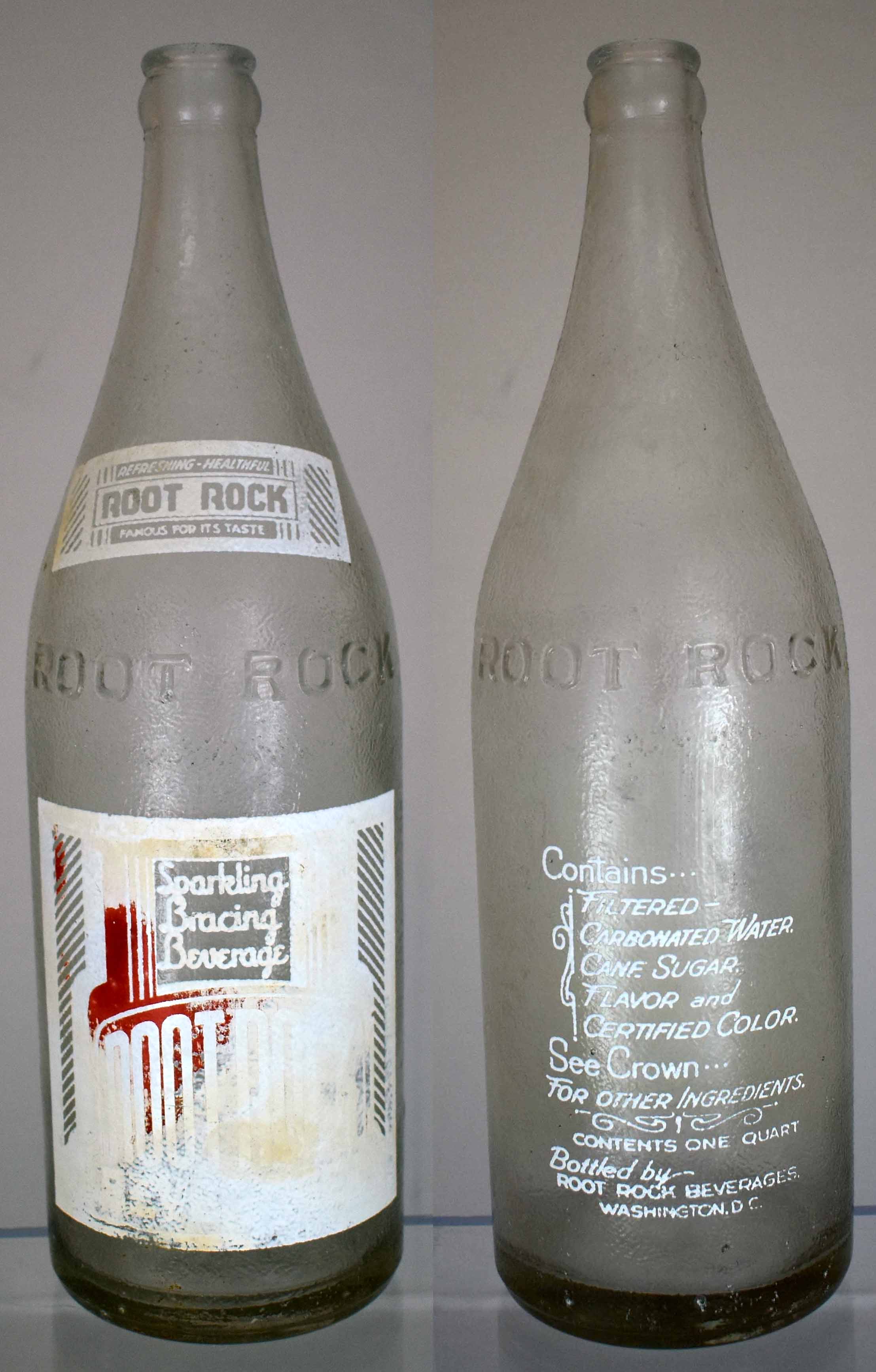 book # (unlisted) This is an 11.75" tall bottle with 2 labels that say: neck label: REFRESHING HEALTHFUL / ROOT ROCK / FAMOUS FOR IT'S TASTE large label: Sparkling / Bracing / Beverage / ROOT ROCK / PALE DRY / GINGER ALE / MIN. CONTENTS 32 FL. OZS. / Refreshing-Healtful / ROOT ROCK GINGER ALE CO. / WASHINGTON, D.C. Embossed on base : CONTENTS / 1 FULL QUART |